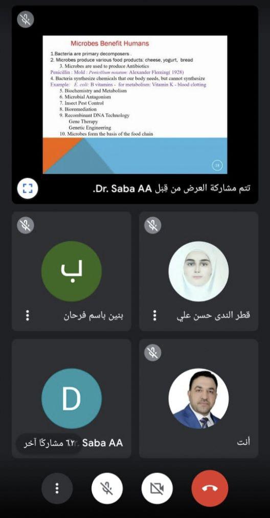Today, Saturday 16/10/2021, Prof. Dr. Abd al-Amir Abdullah al-Musawi, Dean of the College of Nursing at Basra University, continued the electronic lectures for the academic subjects, with the intervention with the students and emphasizing that the lecture should be interactive with the students’ question about the nature of the materials and the things that make them easier to understand and assimilate the scientific material. |