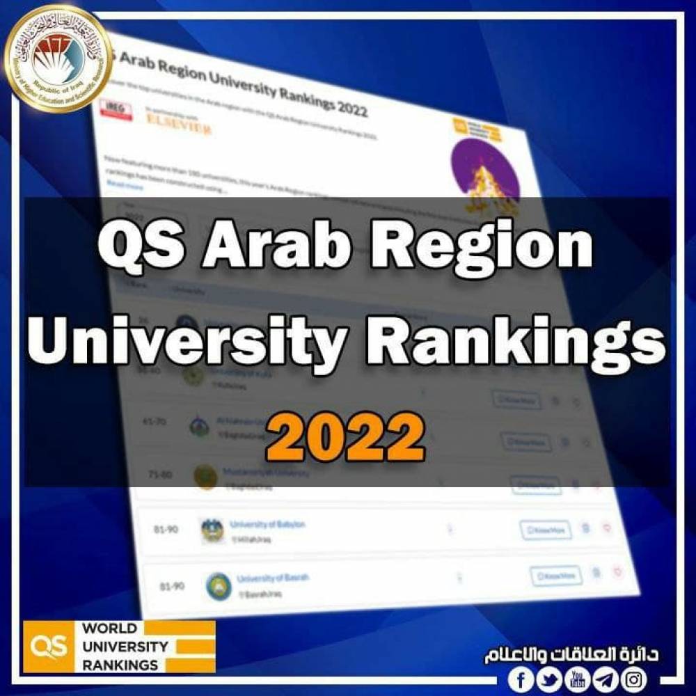The official website of the ranking (https://www.topuniversities.com/university-rankings/arab-region-university-rankings/2022) recorded the attendance and competition of twenty-two Iraqi universities, an increase of 6 universities over last year's edition, where Baghdad University topped the 26th place out of one hundred and eighty-one Arab universities competed according to academic reputation (30%), employer reputation (20%), faculty/student ratio (15%), international research network (10%), web impact (5%), proportion of staff with a PhD (5%), citations per paper (5%), papers per faculty (5%), proportion of international faculty (2.5%) and proportion of international students (2.5%).