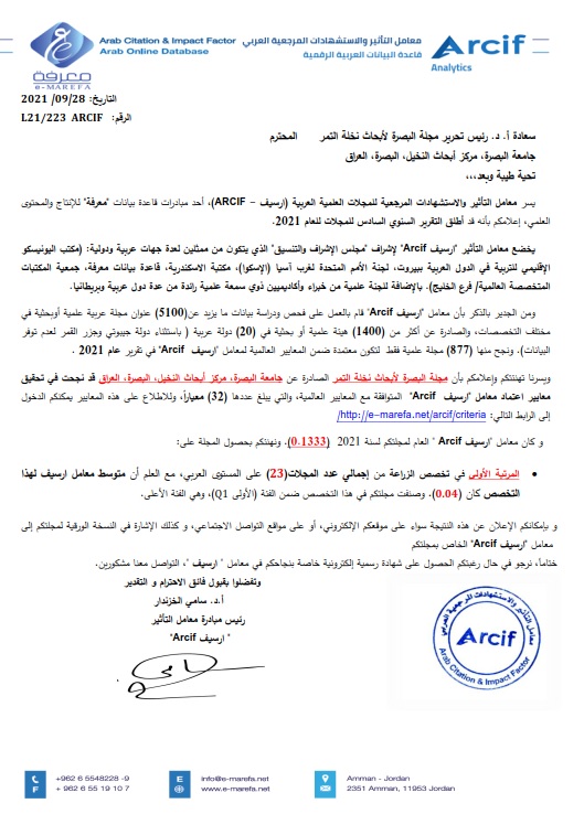 Basrah Journal for Date palm Research obtained the coefficient of influence and reference citations of Arab scientific journals and the coefficient of influence, which the Journal obtained for 2021 (0.13) and was ranked within the first category (Q1) and obtained the first place among 23 Arab journals in the field of Agricultural Sciences was examined.