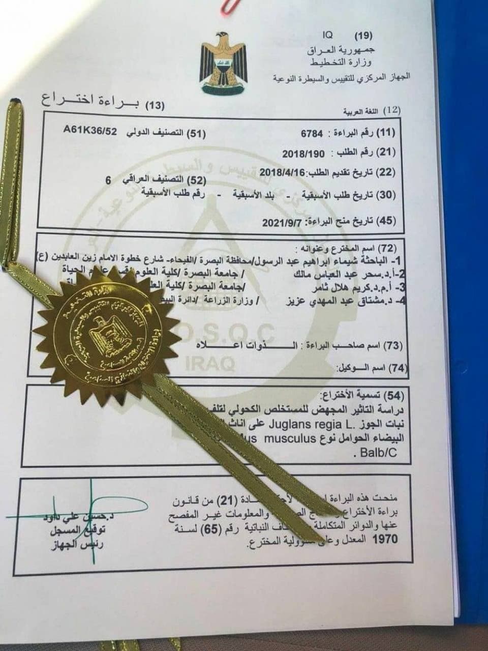 A research team at the College of Science at the University of Basrah, consisting of Dr. Karim Hilal Thamer, Dr. Sahar Abdul-Abbas Malik, researcher Shaima Ibrahim and Dr. Mushtaq Talib Abdul-Mahdi from the Veterinary Hospital, obtained a patent to use the alcoholic extract of walnut bark by oral dosing on pregnant female white mice