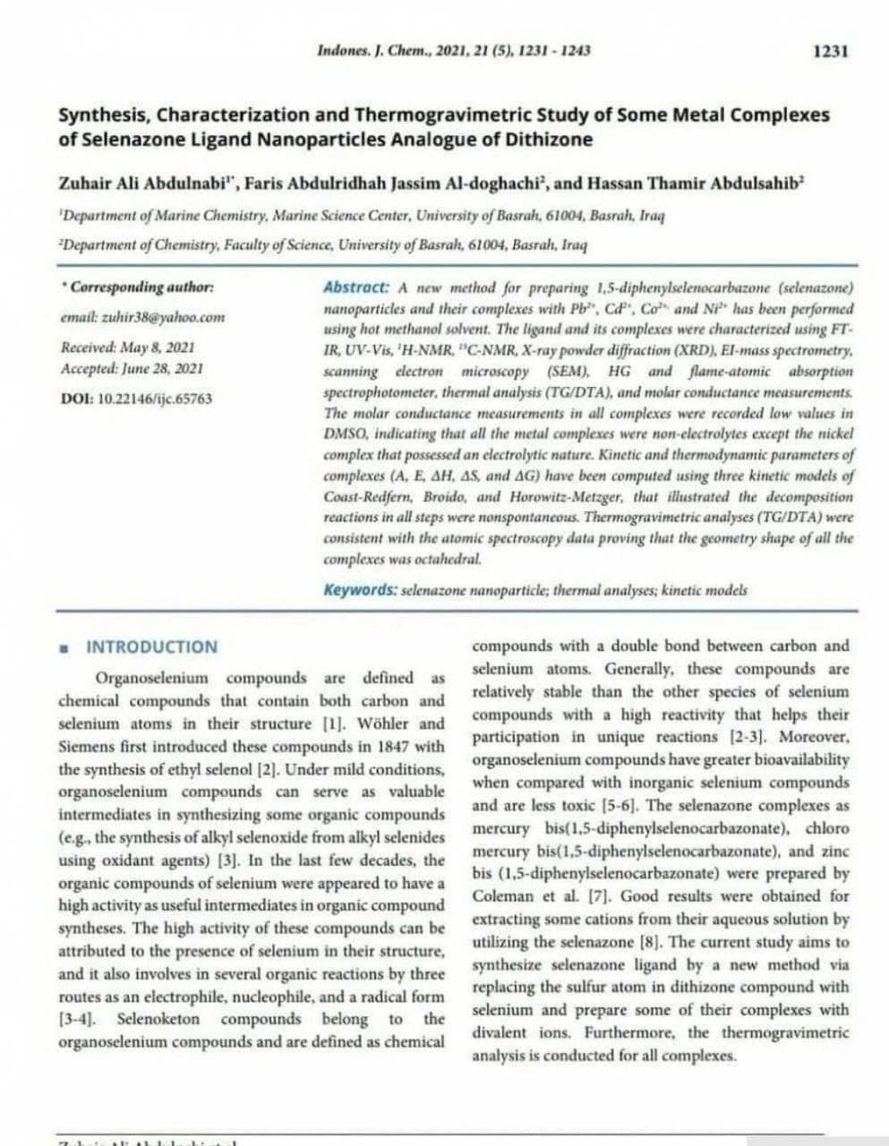 A scientific study at the College of Science at the University of Basrah, prepared by the research team, Dr. Hassan Thamer Abdul-Saheb, Dr. Faris Abdul-Reza Al-Dogji, and PhD student Zuhair Ali Abdul-Nabi, examined the use of a new method to prepare nanoparticles of the compound (selenazone) and its complexes with ions of lead, cadmium, cobalt and nickel using a hot methanol solvent