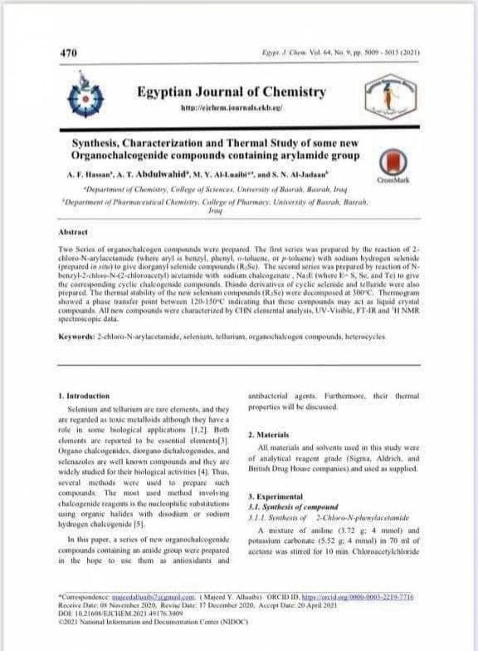 The study, which was published in the Egyption Journal of Chemistry, classified within Scopus containers, showed the preparation of two series of organic chalcogen compounds