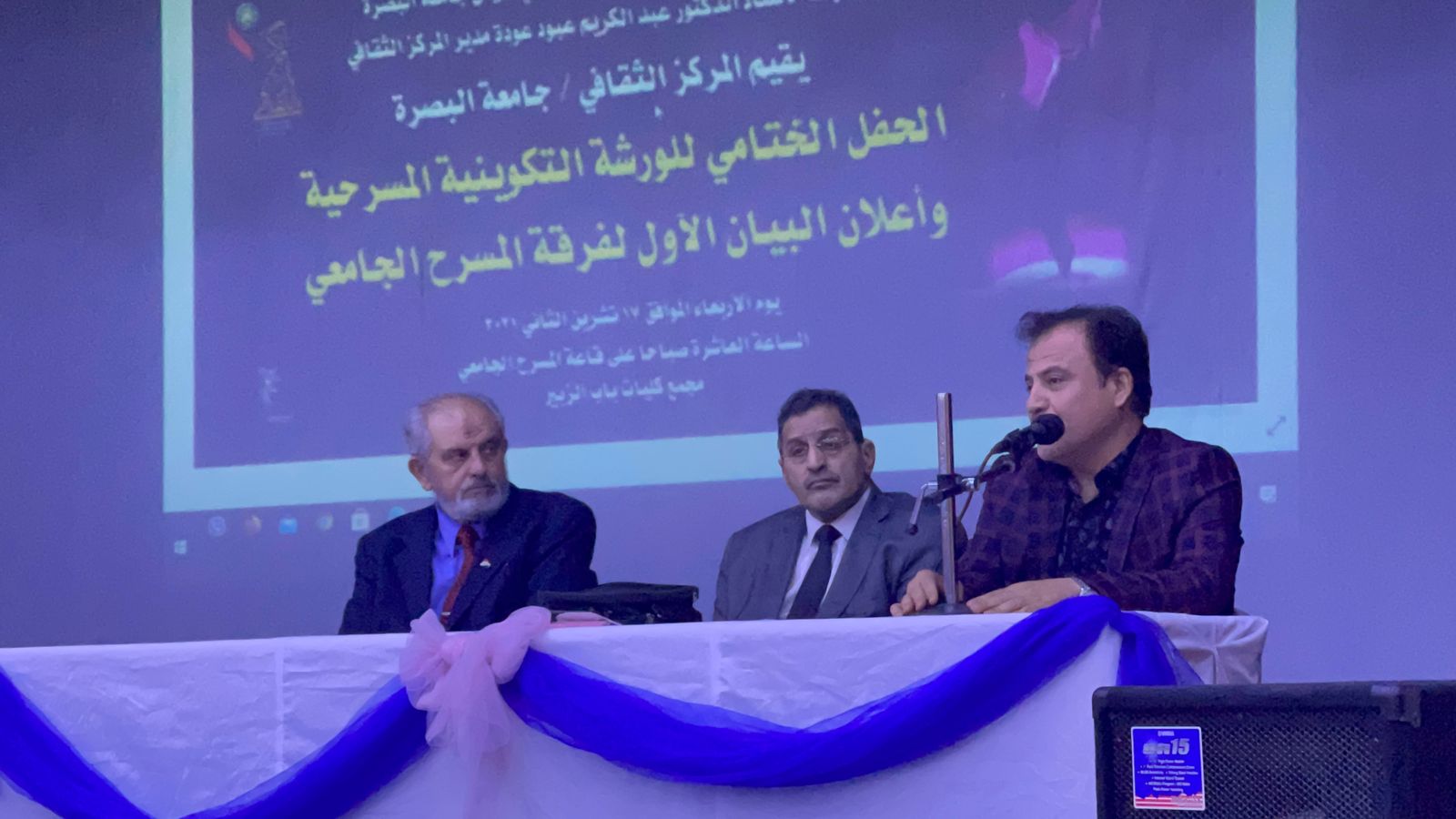 بحضور نخبة من المثقفين والفنانين في البصرة و برعاية رئيس جامعة البصرة الأستاذ الدكتور سعد شاهين حمادي اعلن المركز الثقافي في جامعة البصرة، الاربعاء الموافق 17 / 11 / 2021 ختام الورشة التكوينية المسرحية وقراءة البيان الاول لاعادة تاسيس فرقة المسرح الجامعي بشكل رسمي للنهوض بالفن المسرحي في المدينة من خلال وضع خارطة عمل متكامله للانتاج المسرحي .