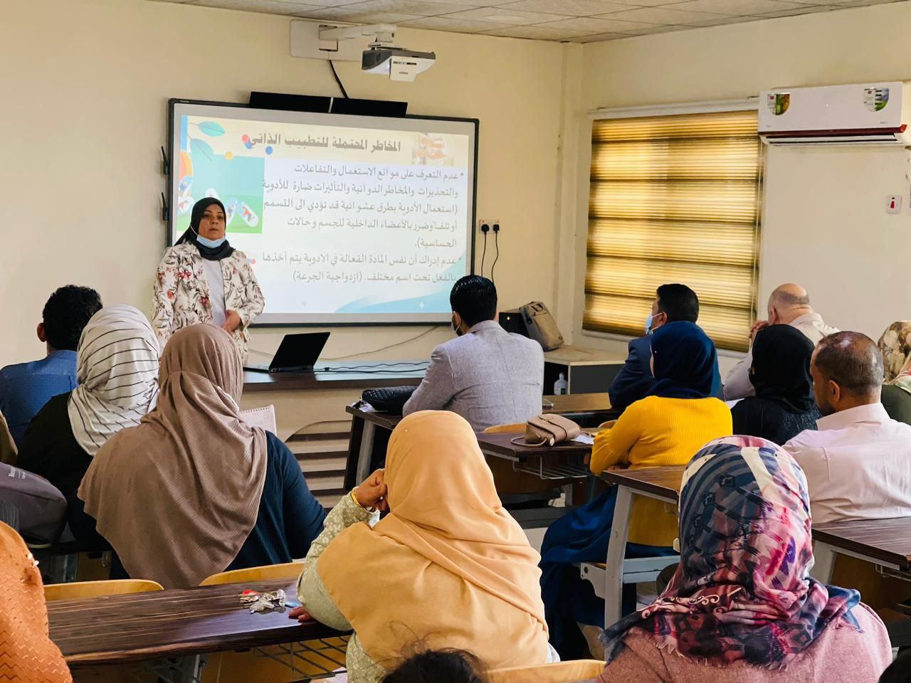College of Nursing Announcements Alaa Al Husseini Under the patronage of Prof. Dr. Abdul-Amir Abdullah Al-Mousawi, Dean of the College of Nursing, University of Basra. Our college organized a scientific lecture on self-medication, in which Prof. Dr. Samira Muhammad Ibrahim and Dr. Atour Taleb lectured. The lecture was attended by Dr. Hisham Hussein Abdel-Raouf, Associate Dean for Administrative Affairs at the College of Nursing, and a group of his professor and college staff. The lecture included about self-medication, the reasons for its use, and the potential risks of self-medication And the potential benefits of self-medication and temporary risks of self-medication. It also includes the practice of spiritual exercise in aiding treatment, such as changing the food pattern to beneficial foods, using medicinal herbs, improving fitness with exercise, eliminating negative feelings and having positive feelings. The lecture aims to spread the culture of integrative medicine, which works to exploit the mind as a self-pharmacy to treat mental and physical illnesses |