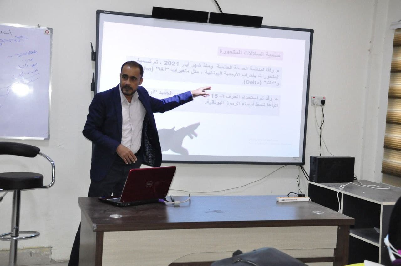 Under the patronage of Prof. Dr. Abdul-Amir Abdullah Al-Mousawi, Dean of the College of Nursing at the University of Basra, and in cooperation with the Continuing Education Unit at the college The College of Nursing at the University of Basra organized an awareness seminar on (Amicron axis and virus prevention), in which the teacher, Dr. The symposium included identifying the characteristics of the mutated Omicron strain and mutations, which were issued by the World Health Organization in terms of spread and infection events. The causes of infection and how to prevent them were addressed to protect individuals and society. The symposium aimed to study some of the solutions and proposals presented by the lecturer in the symposium and to familiarize the attendees with the new Omicron strain, the latest data issued by it, and the effectiveness of current vaccines against it. Al-Moussawi stressed the holding of educational seminars and lectures on dealing with the Corona epidemic and the new mutant, Omicron, because exaggeration or underestimation of this topic has a negative impact. It is also necessary to raise awareness among students of this important and conscious segment