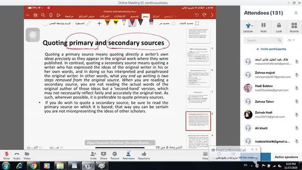 Basra University organized a workshop on how to prepare and cite references for students of the fourth stage of the morning and evening studies in the English language department. The workshop included a lecture given by the teacher in the Department of English Language Eng. Alaa Hussein Sharhan discussed the methods of citing references and organizing them during the process of writing the graduation thesis, focusing on three aspects of inference and citation: internal within the body of the research, quoting from primary and secondary references and how to summarize the ideas of other writers indirectly. The workshop discussed the references contained in the text, how to quote the primary and secondary results, report presentation of what is mentioned in the references, as well as ways to avoid scientific and literary plagiarism. The workshop demonstrated the documentation systems in academic writing, so it included how to review the mention of the writer, the date of publication, the pages cited from it, the method of finding information about the name of the publisher, the place of publication, the name of the publishing city, and other basic matters in organizing the reference page.