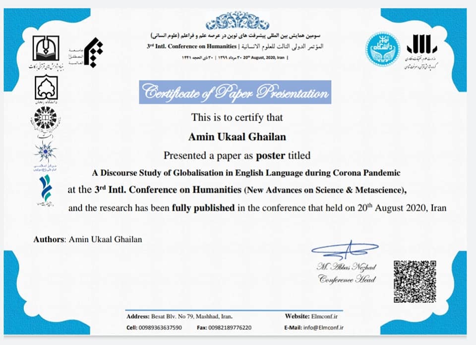 Amin Akkal Ghaylan Al-Kaabi, the teacher in the English Department of the College of Education for Human Sciences, participated in the Third International Conference on Human Sciences held by Tehran University