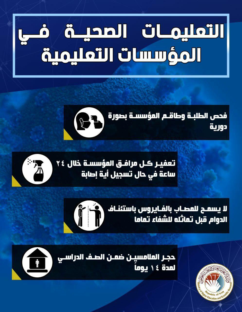 The Ministry of Higher Education and Scientific Research published health instructions to prevent communicable diseases, especially Covid 19. The Dean of the College, Prof. Dr. Abd Al-Amir Abdullah Al-Mousawi mentioned that the college, since the first day of working hours this year, has undertaken preventive measures from providing masks and sterilization materials, conducting periodic checks for students and cadres, and fumigating all laboratories after the completion of practical teaching and publishing educational posters in the corridors of the college in order to preserve the lives of our dear students and staff Teaching and our staff.