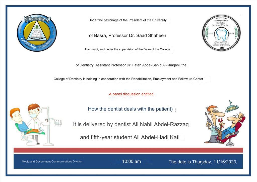 The College of Dentistry, in cooperation with the Rehabilitation, Employment and Follow-up Division, holds a discussion panel entitled (The mechanism of the dentist’s dealings with the patient)