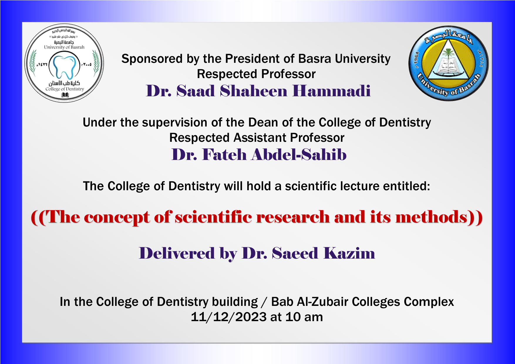 The College of Dentistry will hold a scientific lecture entitled (The concept of scientific research and its methods)