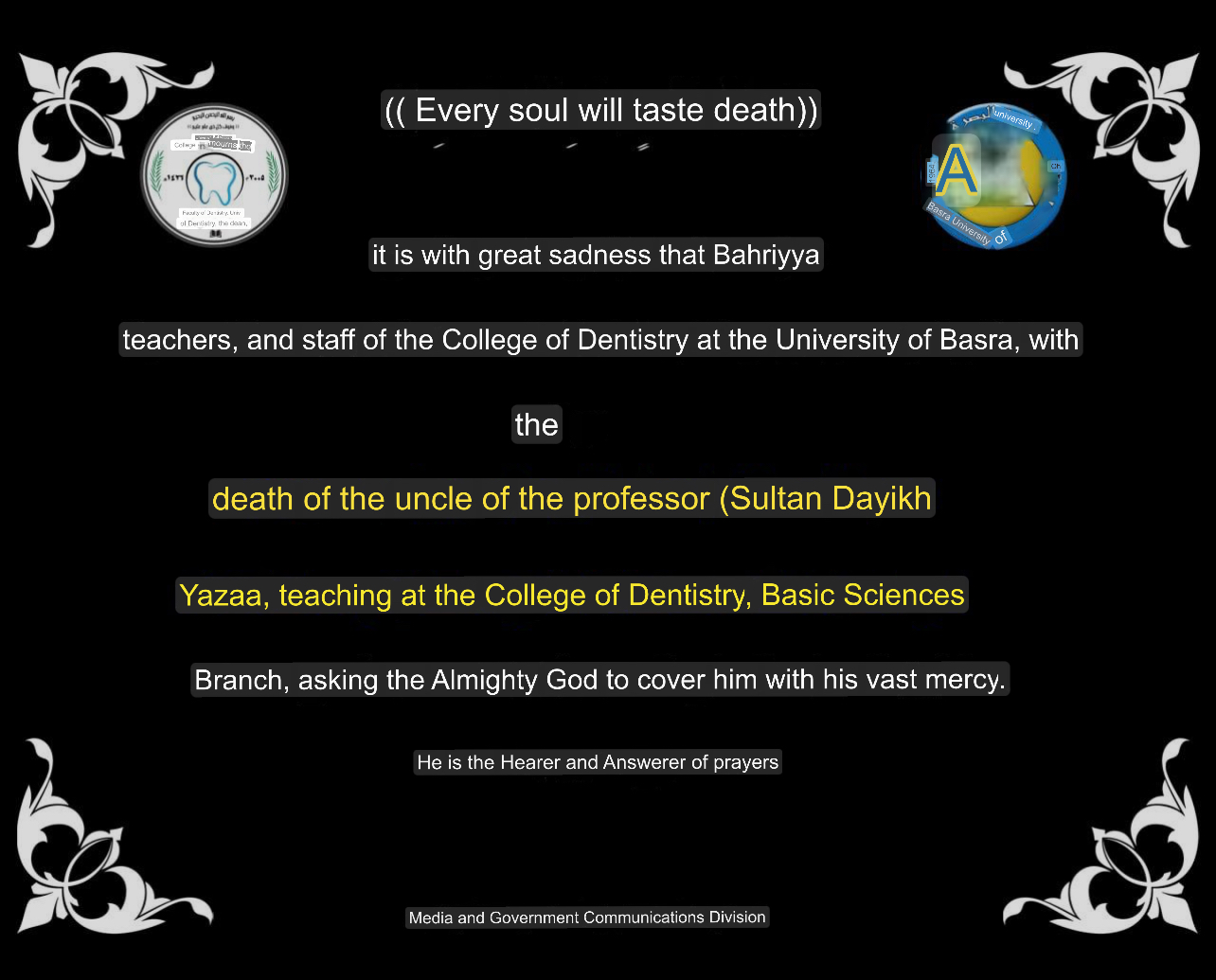 The Deanship of the College of Dentistry extends its condolences to Professor Sultan Dayikh on the death of his uncle
