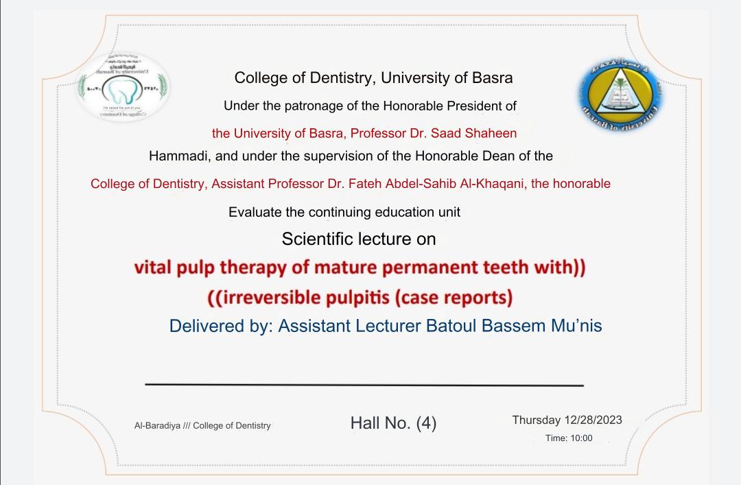The College of Dentistry will hold a scientific lecture entitled (Vital pulp therapy of mature permanent teeth with irreversible pulpitis (case reports))