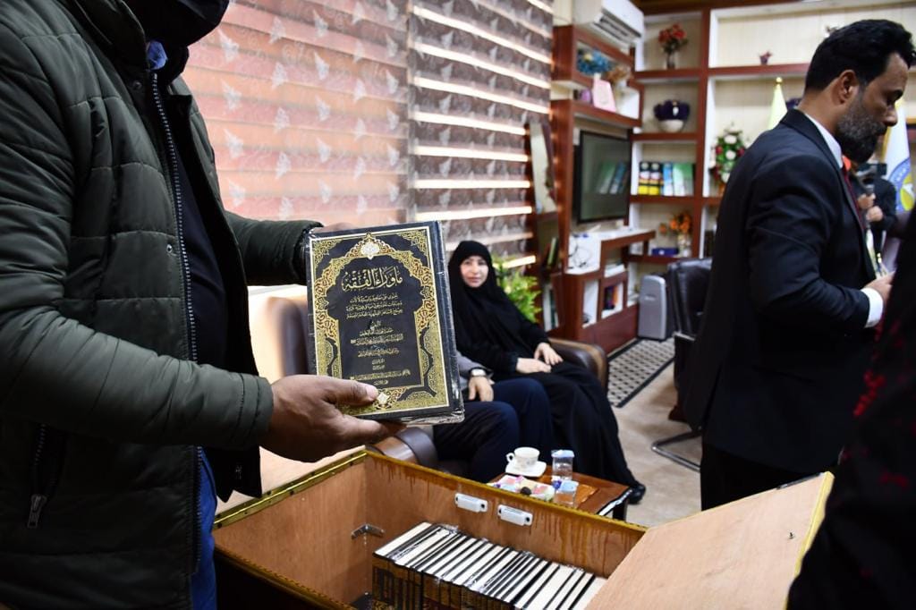 The Dean of the College expressed her thanks and gratitude to the visiting delegation for the precious gems they provided from the books of the martyr Muhammad Sadiq al-Sadr (may God sanctify his secret), which are an important addition to the scientific library.