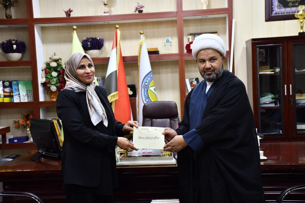 The delegation, consisting of the director of the office, Sheikh Halim Al-Fatlawi, and a number of accompanying persons, were received by the Dean of the College of Education for Human Sciences, Professor Dr. Nidaa Muhammad Baqir, and members of the College Council. The delegation presented a gift to the office of Mr. Muqtada Al-Sadr, which represents a valuable collection of publications from the Authority for the Heritage of the Happy Martyr, Mr. Muhammad Sadiq Al-Sadr. (May his secret be sanctified).