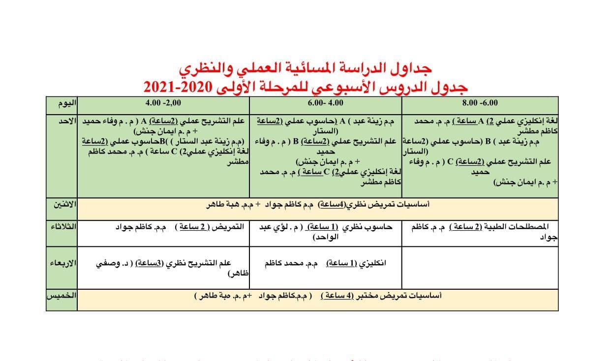 (The practical and theoretical evening study schedule for the first phase (2020-2021