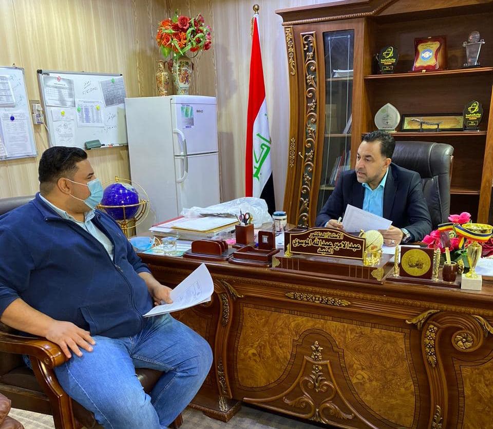 | Prof. Dr. Abdul Amir Abdullah Al-Mousawi, Dean of the College, met with Assistant Lecturer Saadoun Abbas Idan, Director of Registration and Student Affairs. During the meeting, the directives were made to expedite the completion of hosting requests for all academic levels, as well as to expedite the completion of each application submitted by students and to emphasize the verification of documents and endorsements. |