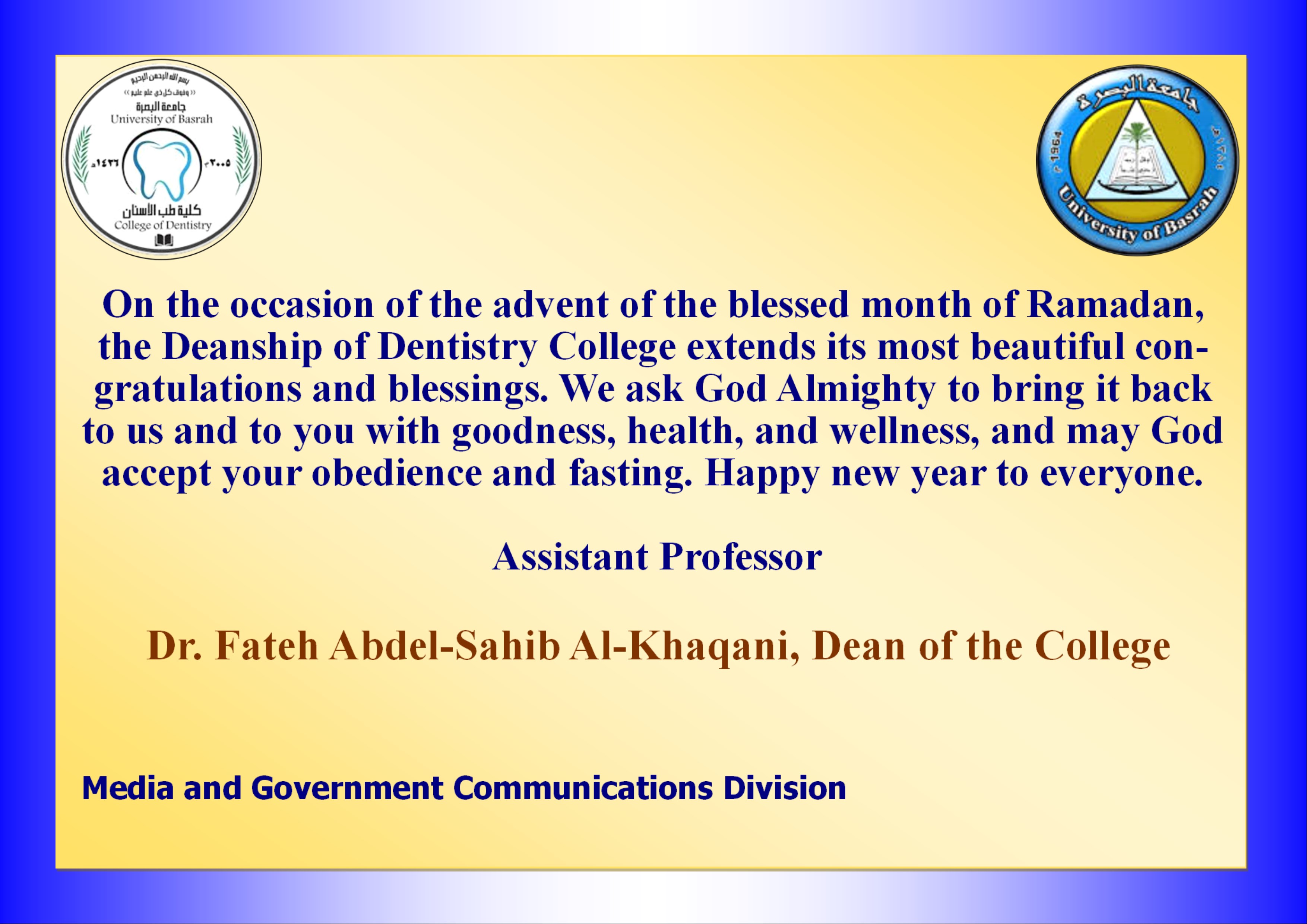 Congratulations from the Deanship of the College of Dentistry on the occasion of the holy month of Ramadan