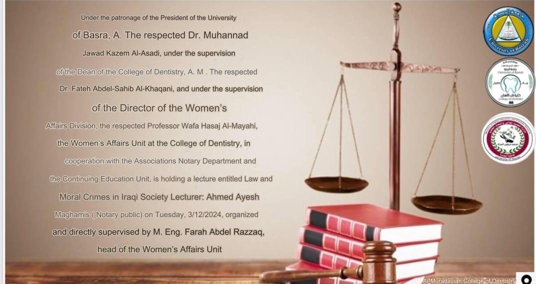 The College of Dentistry, in cooperation with the Women’s Affairs Unit, will hold a lecture entitled ((Law and moral crimes in Iraqi society))