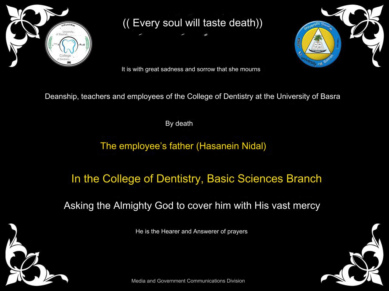 The Deanship of the College of Dentistry extends its condolences to the employee (Hasnain Nidal) on the death of his father