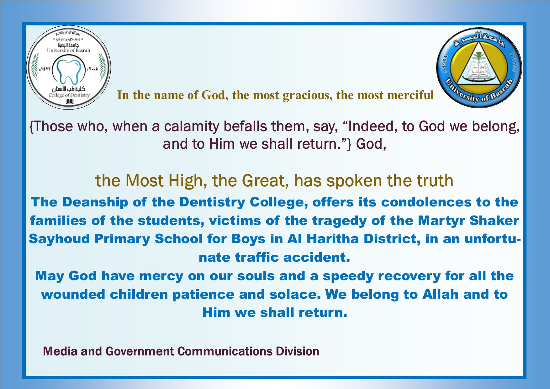 Condolences from the Deanship of the College of Dentistry to the families of students who were victims of the tragedy of the Martyr Shaker Sayhoud Primary School