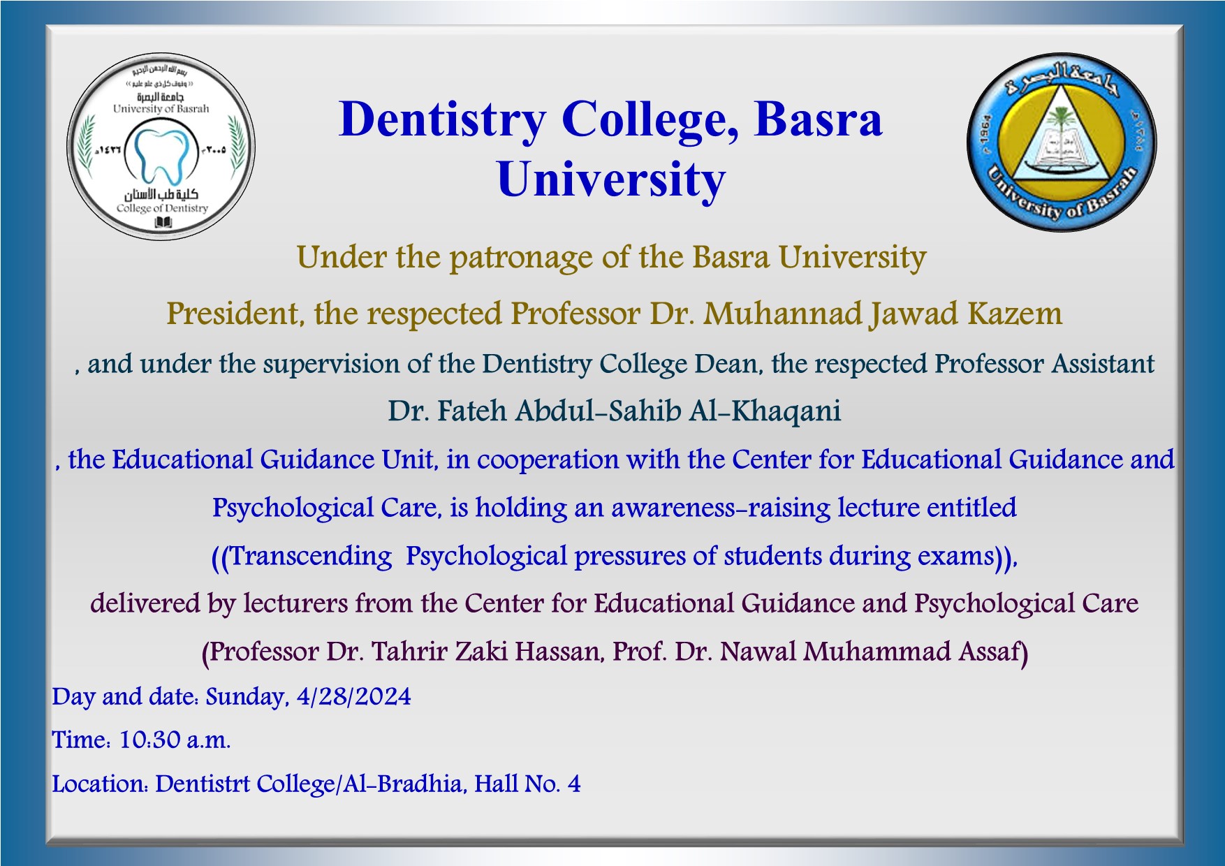 The College of Dentistry, in cooperation with the Educational Guidance Unit, will hold an awareness-raising lecture entitled ((Overcoming psychological pressures for students during exams))
