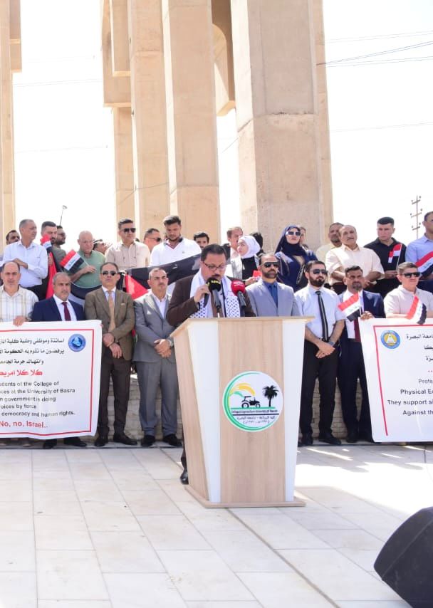 Under the patronage of the President of the University of Basra, Professor Dr. Muhannad Jawad Kazem, the University of Basra organized today, Sunday, 5/5/2024, a stand in solidarity with the people of the Gaza Strip, in a manifestation of rejection of the repeated Zionist attacks, violations, and massacres practiced by the Zionist occupation against the Palestinian people.