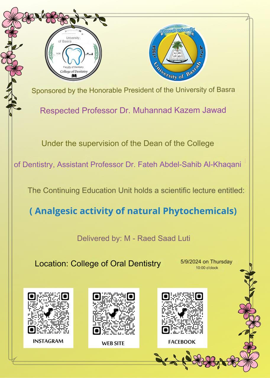 The College of Dentistry, in cooperation with the Continuing Education Unit, will hold a scientific lecture entitled (Analgesic activity of natural phytochemicals)