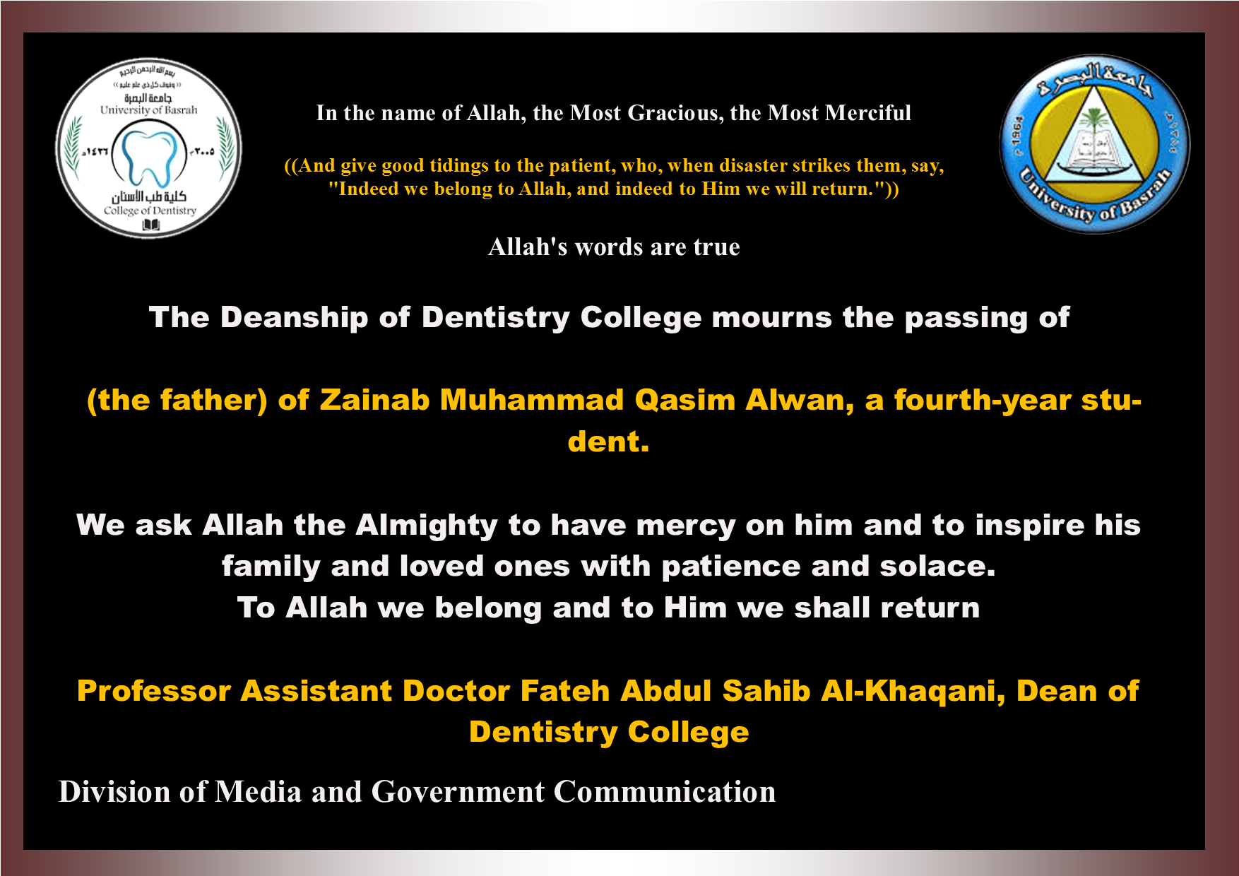 The Deanship of the College of Dentistry extends its condolences to the fourth-year student (Zainab Muhammad Qasim) on the death of her father