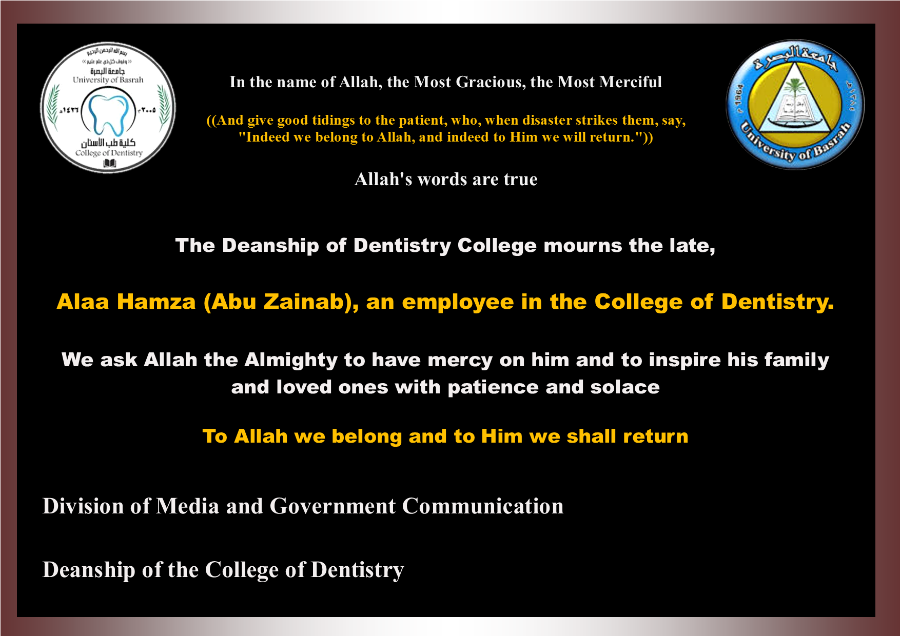 Condolences from the Deanship of the College of Dentistry on the death of employee Alaa Hamza (Abu Zeinab)