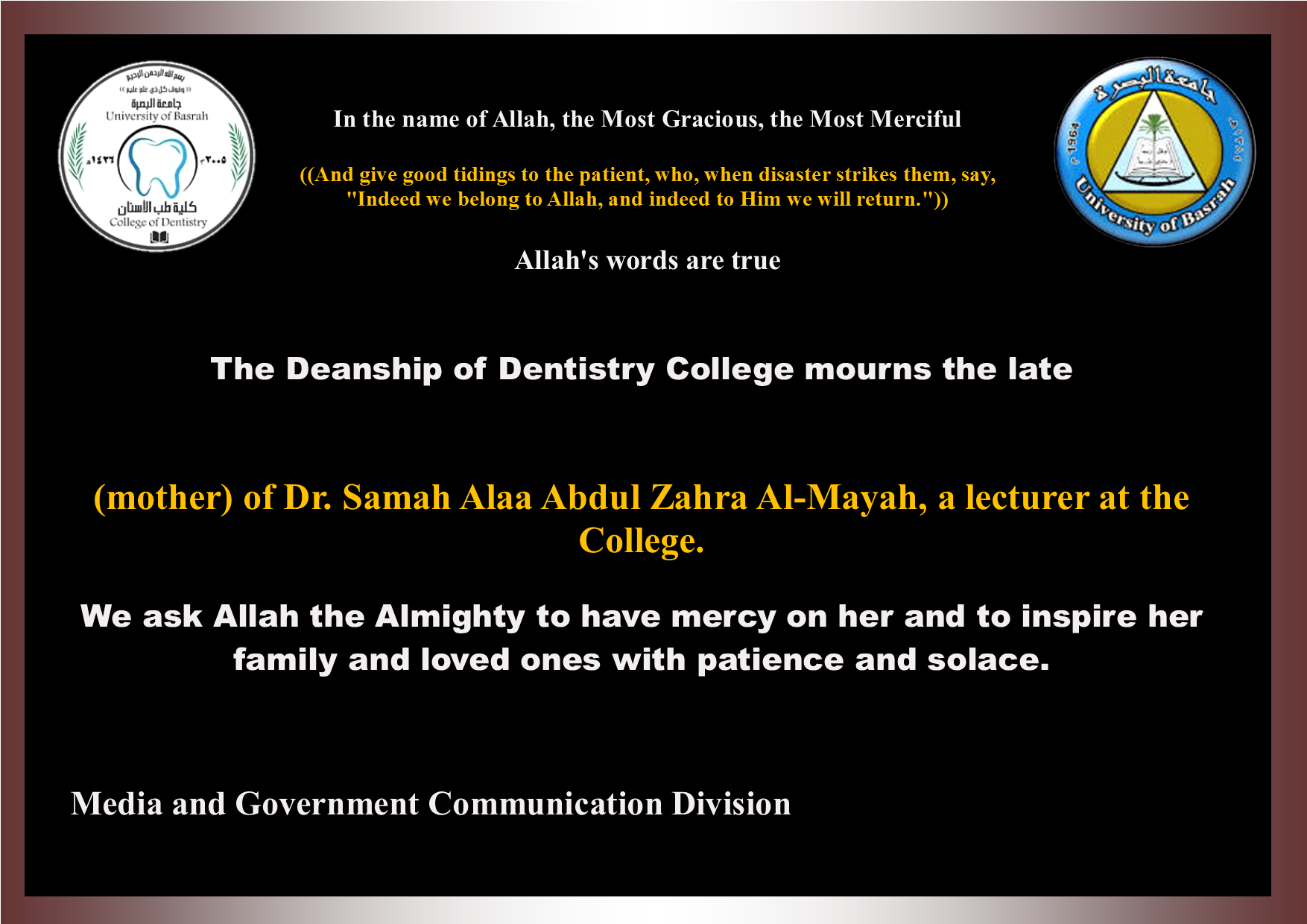 Condolences from the Deanship of the College of Dentistry to Dr. (Samah Alaa Abdel Zahra) on the death of her mother