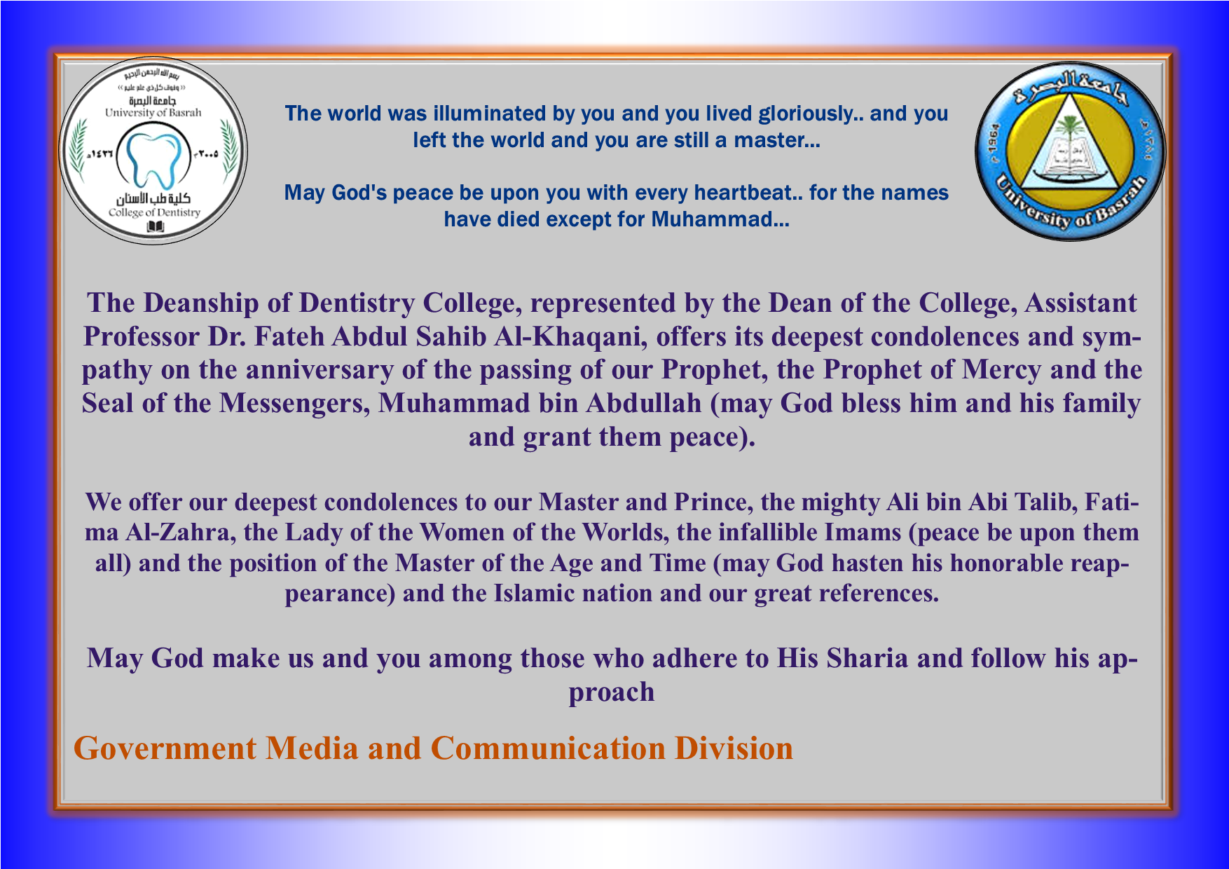 Condolences of the Deanship of the College of Dentistry on the anniversary of the passing of our Prophet, the Prophet of Mercy, Muhammad bin Abdullah (may God bless him and his family and grant them peace)