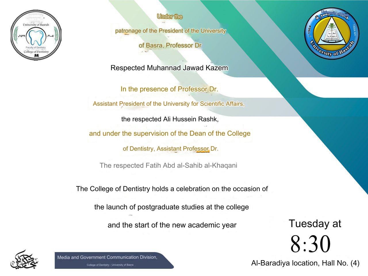The College of Dentistry will hold a celebration on the occasion of the launch of postgraduate studies and the beginning of the new academic year.
