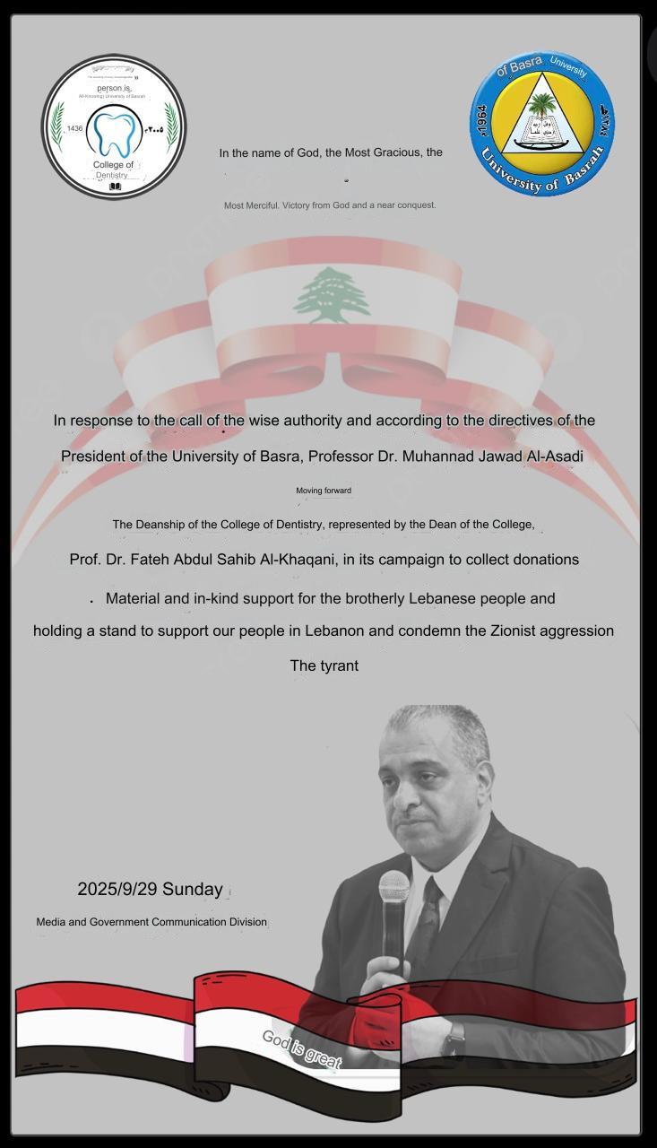 The Deanship of the Faculty of Dentistry is holding a campaign to collect financial and in-kind donations to support the brotherly Lebanese people.