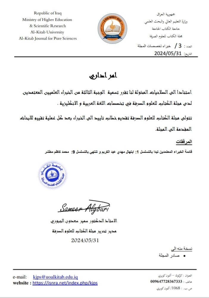 Lecturer Dr. Muhammad Mutasher, a member of the teaching staff at the College of Nursing at the University of Basra and the meeting, was selected as a member of the Scientific Experts Committee issued by the College of Pure Sciences at Al-Kitab University for the magazine (Al-Kitab for the College of Pure Sciences). This selection comes, according to the scientific body of the magazine, due to the scientific reputation enjoyed by the lecturer Muhammad Mutasher Al-Kanani.
