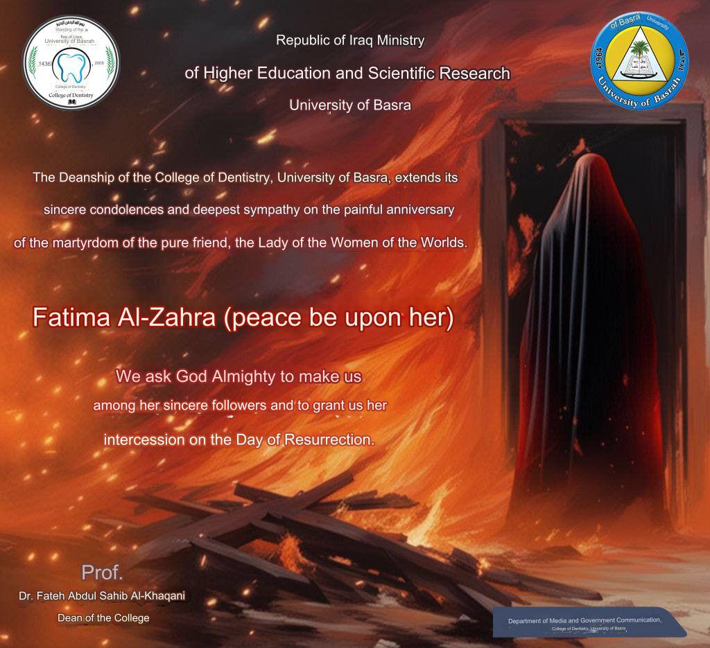 Condolences of the Deanship of the College of Dentistry on the anniversary of the martyrdom of the pure friend, the Lady of the Women of the Worlds