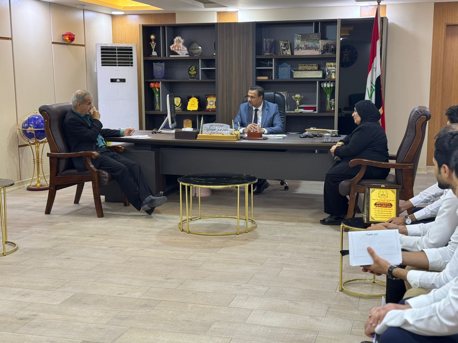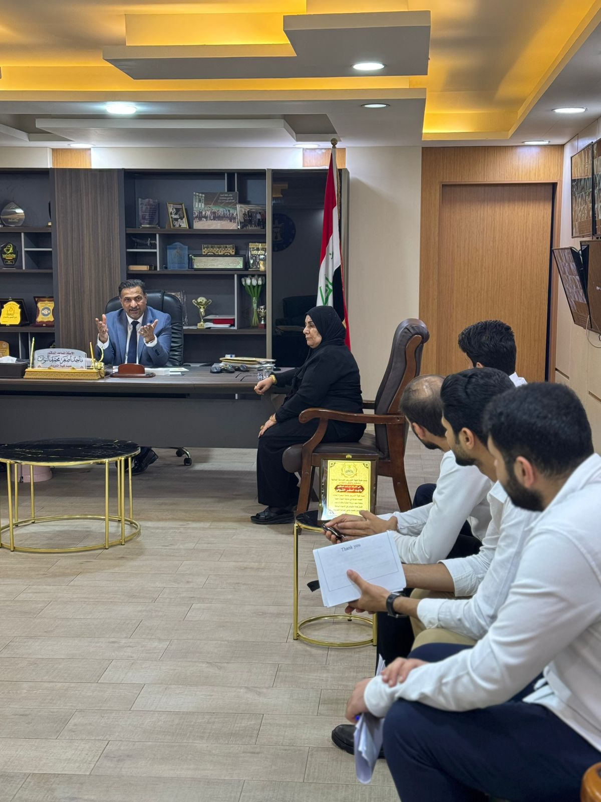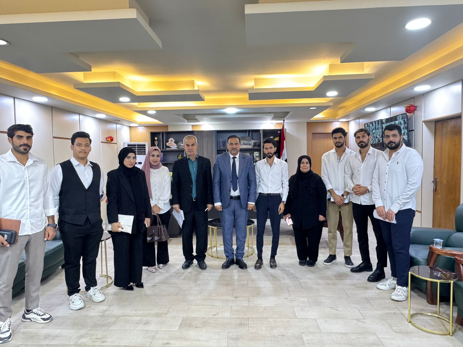 Assistant Professor Dr. Majid Asghar Muhammad Al-Nawab, Dean of the College of Nursing at the University of Basra, met with the Assistant Professor Dr. Sundus Baqir Dawood, Assistant Dean for Scientific Affairs, and Assistant Professor Dr. Abdul Karim Salman, Assistant Dean for Administrative Affairs, his sons, the representatives of the students and the morning and evening studies, and reviewed the important matters related to the academic year and its requirements and cooperation to overcome obstacles. He also urged them to make efforts and adhere to the ministerial and university instructions and controls and to be regular in attendance and preserve the college's property. The deputies also stressed the need to maintain the cleanliness of the college and its corridors. After that, the Dean of the College listened to the students' proposals and at the end of the meeting, he wished them success in their academic and scientific career. At the end of the meeting, the students presented an appreciation shield to the Dean of the College of Nursing, Assistant Professor Dr. Majid Asghar Muhammad Al-Nawab, on the occasion of his reassignment to the Deanship and wished him More giving and excellence in the service of our beloved Iraq