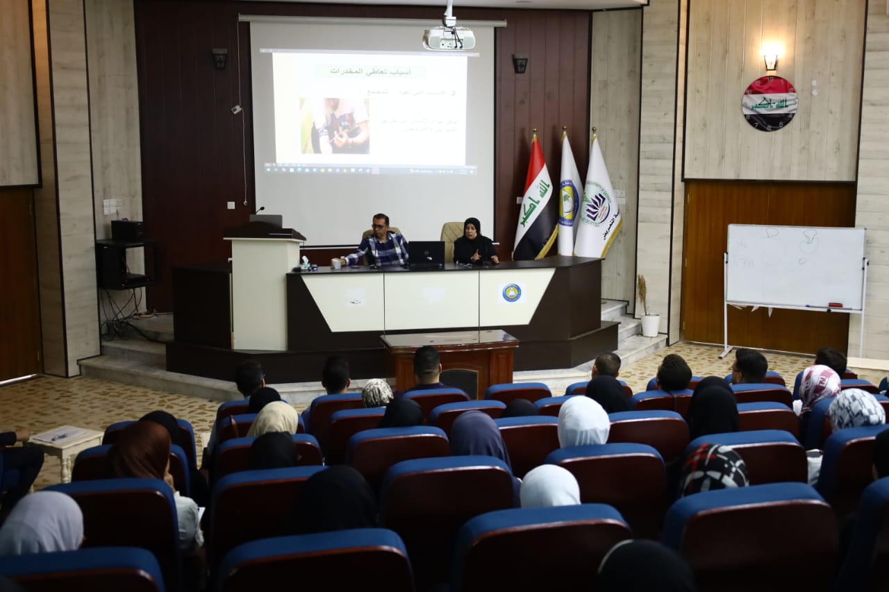 Under the patronage of Prof. Dr. Muhannad Jawad Kazim, President of Basra University, and under the direct supervision of Assistant Professor Dr. Majid Muhammad Asghar Al-Nawab, Dean of the College of Nursing at Basra University, and in coordination with the Basra Police Command, Anti-Narcotics Department, the Continuing Education Unit at the College of Nursing at Basra University organized a symposium on drugs and their psychological, social and economic effects, in which Colonel Fouad Al-Asadi, an expert in drug and psychotropic substances affairs, Assistant Professor Dr. Sundus Baqir Dawood, Assistant Dean for Scientific Affairs, Lecturer Afkar Fadhel Karim, Head of the Nursing Basics Branch, and Lecturer Dr. Firas Abdul Qader, Head of the Community Health Branch, lectured. The symposium included several topics, including defining drugs, their types and divisions, symptoms of drug abuse, the harms of drugs from a health, psychological, social and economic perspective, the role of the family and society in eliminating drug addiction, and methods of preventing drugs. The symposium aimed to clarify the dangers of drug abuse on humans and society, especially by young people, and the need to raise awareness and educate about its dangers and tighten penalties for its circulation and abuse. The symposium recommended the need to spread awareness and culture by holding conferences, seminars and workshops in this field to clarify what drugs and stimulants do to the lives of society and destroy them. For his part, Assistant Professor Dr. Majid Asghar Muhammad Al-Nawab, Dean of the College of Nursing, praised the efforts made by the organizing committee of the symposium and all participating teaching staff, praising their attempts to provide the best services in light of the available capabilities, wishing them continued success and brilliance in the service of our dear university.