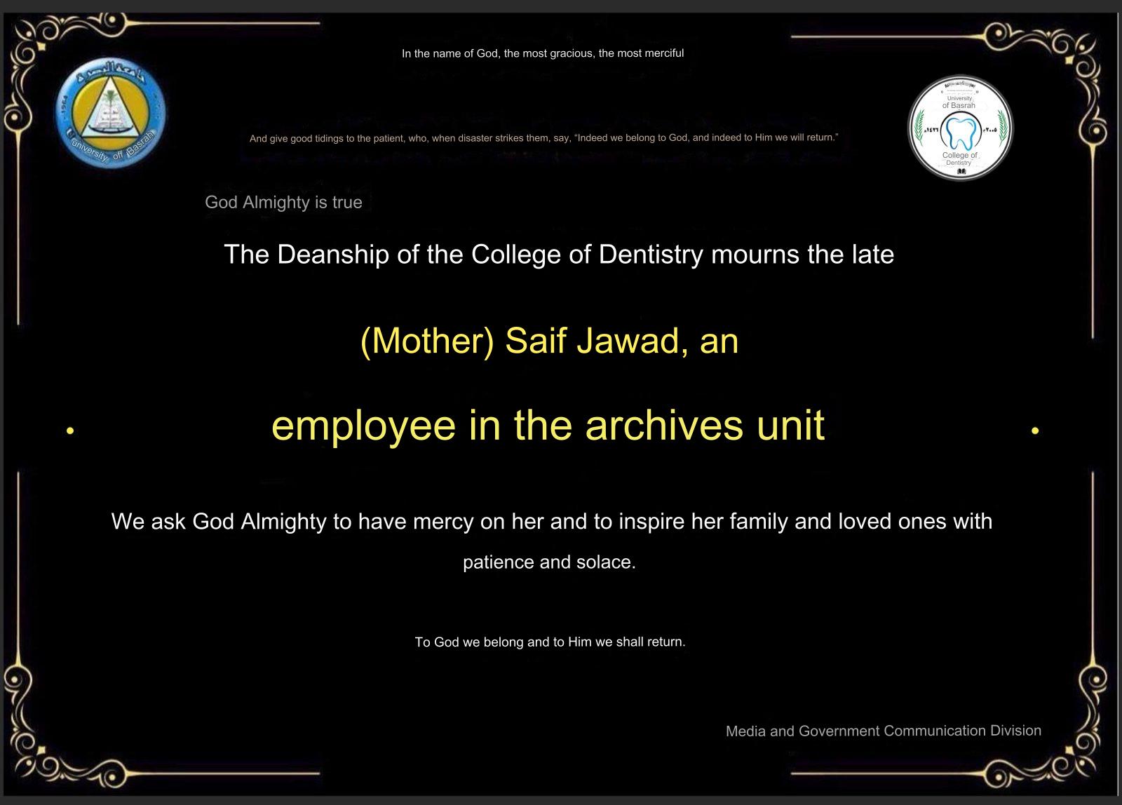 Condolences of the Deanship of the College of Dentistry to the employee (Saif Jawad) on the death of his mother