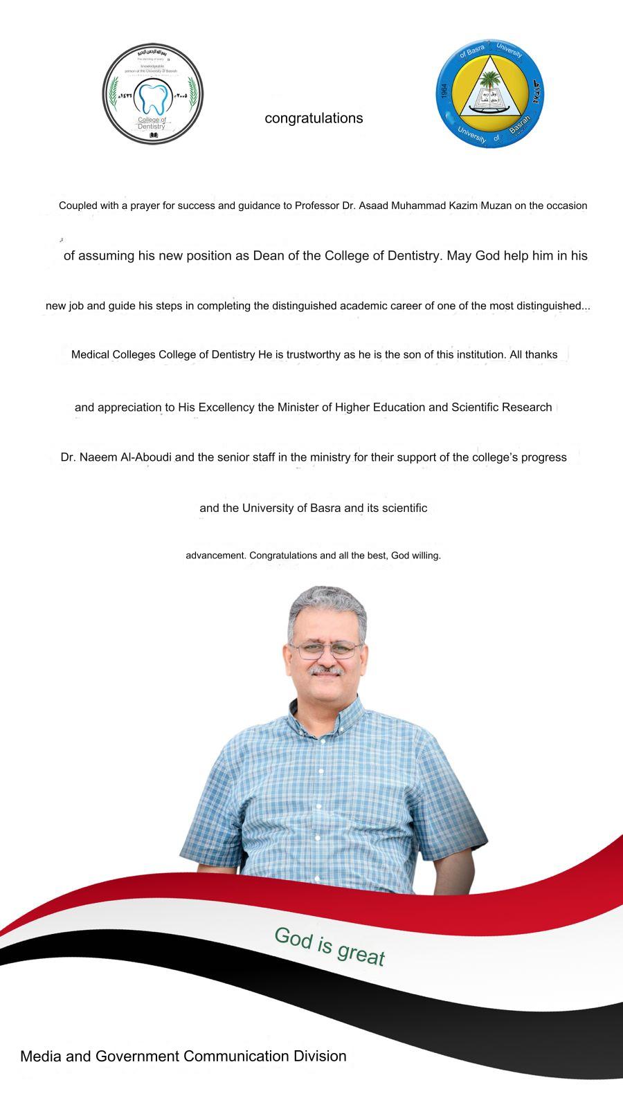 Congratulations to Professor Dr. (Asaad Mohammed Kazim Muzan) on the occasion of his assumption of the position of Dean of the College of Dentistry