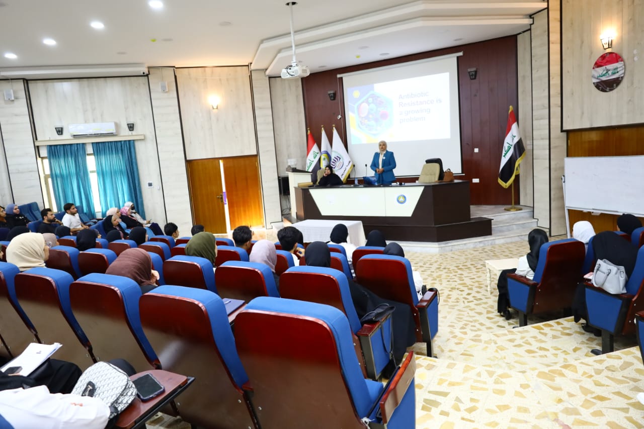 Under the patronage of the President of the University of Basra, Professor Dr. Muhannad Jawad Kazim, and under the supervision of the Dean of the College of Nursing at the University of Basra, Assistant Professor Dr. Majid Asghar Muhammad Al-Nawab The Continuing Education Unit at the College, in cooperation with the Basra Health Department, organized an awareness symposium on antibiotic resistance. The session was supervised by Assistant Professor Dr. Sundus Baqir Dawood, Assistant Dean for Scientific Affairs, and was lectured by the pharmacist, Alaa Muhammad Mahmoud