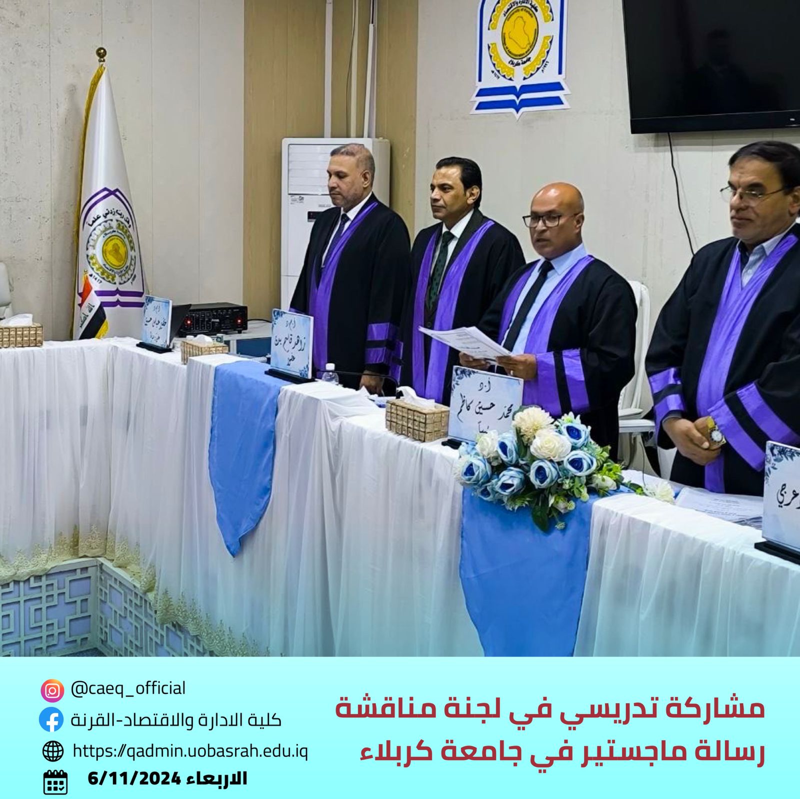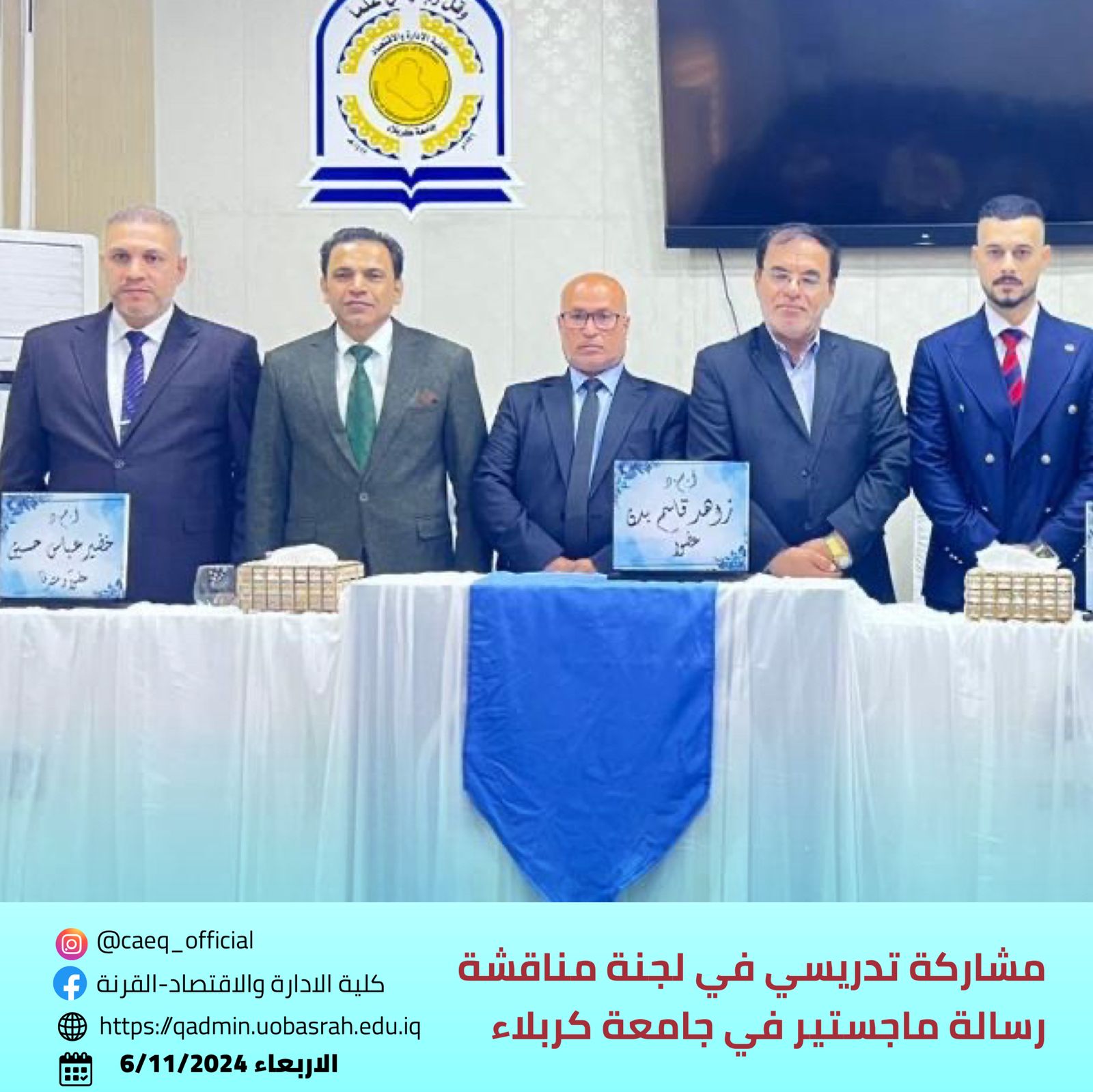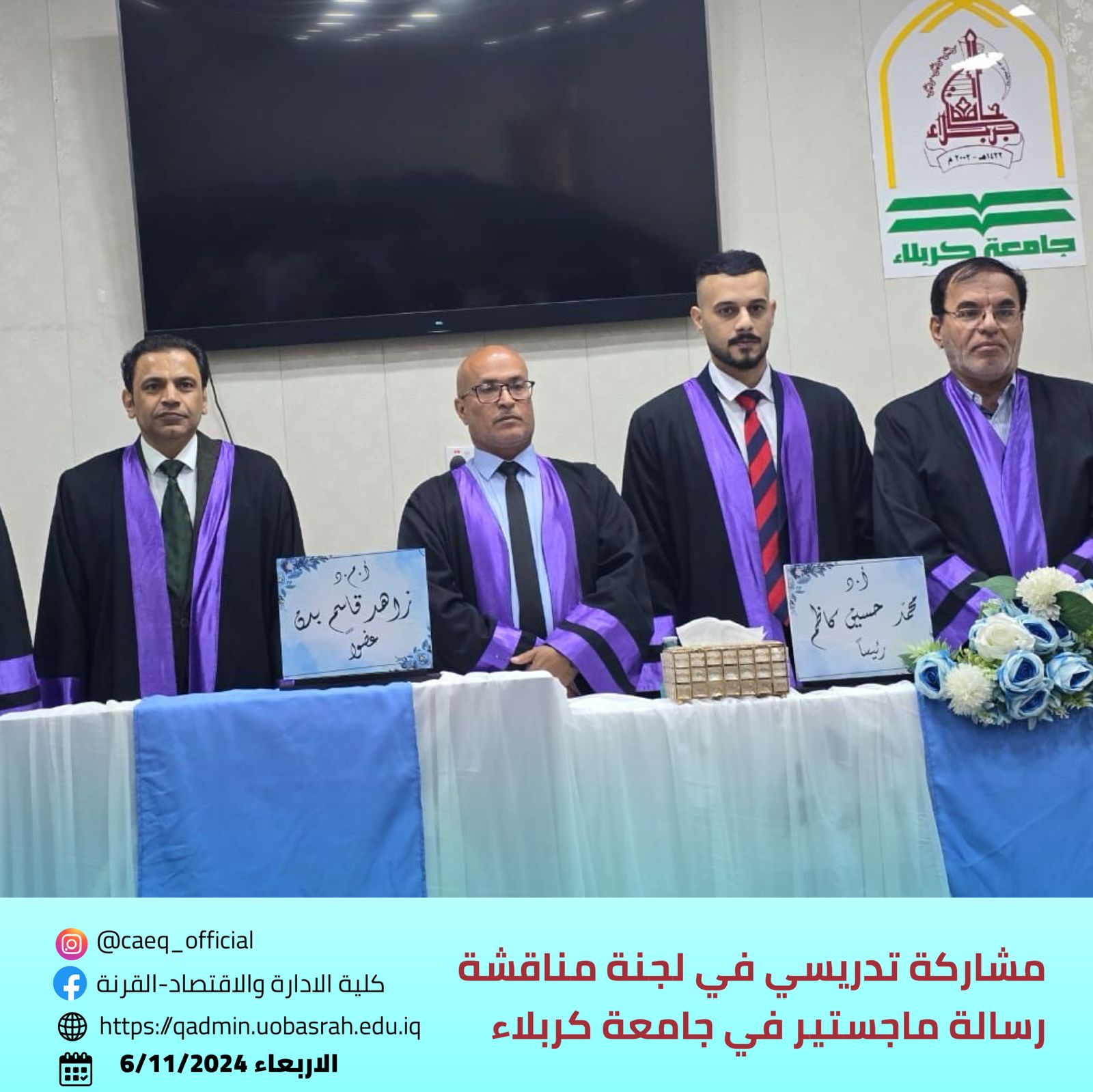 Assistant Professor Dr. Zahid Qasim Badhan, a faculty member at the College of Administration and Economics - Qurna, Department of Finance and Investment at the University of Basra, participated as a member of the committee for a master’s thesis defense at the University of Karbala, College of Administration and Economics. The thesis was titled “The Impact of Dual Economic Shocks on Economic Variables in Iraq for the Period 2004-2023” and was defended on Wednesday, November 6, 2024, at the College of Administration and Economics, University of Karbala.