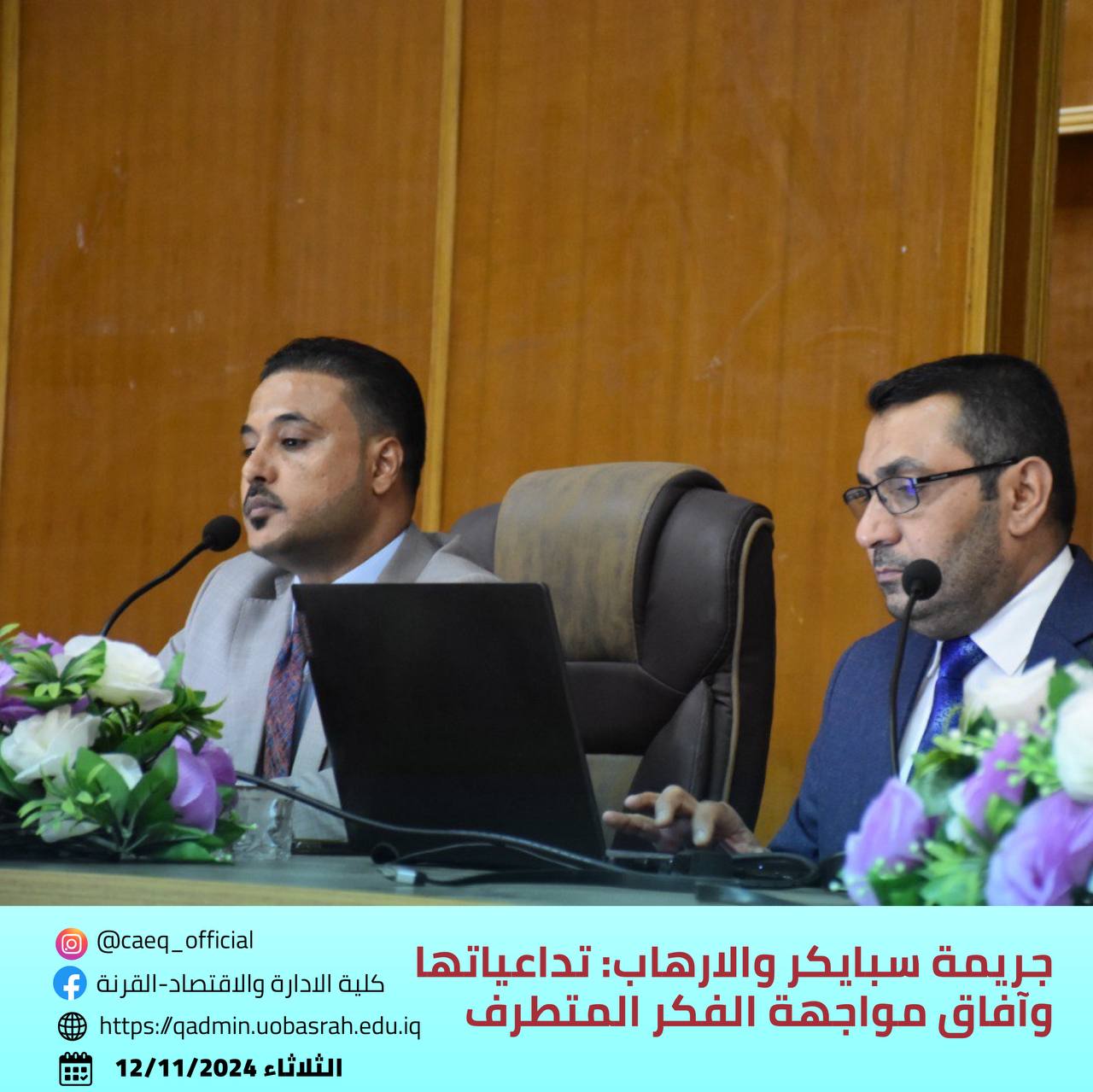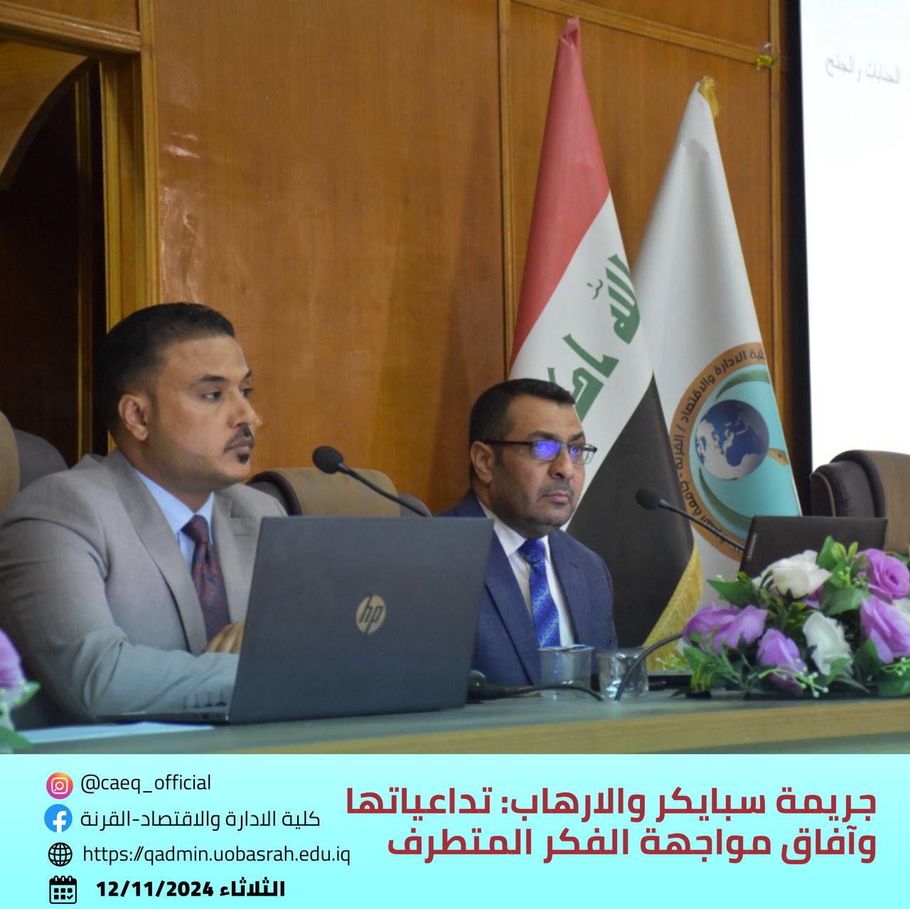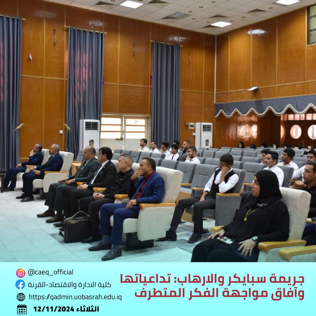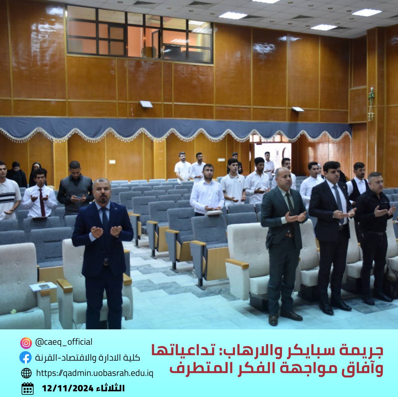 On Tuesday, November 12, 2024, the College of Administration and Economics – Qurna at the University of Basrah organized a scientific symposium titled “The Speicher Massacre and Terrorism: Implications and Prospects for Countering Extremist Ideology.” The symposium was chaired by Professor Dr. Youssef Odeh Ghanem and legal expert Talib Razzaq Saad. It addressed several key topics related to the phenomenon of terrorism and strategies to combat extremist ideologies.