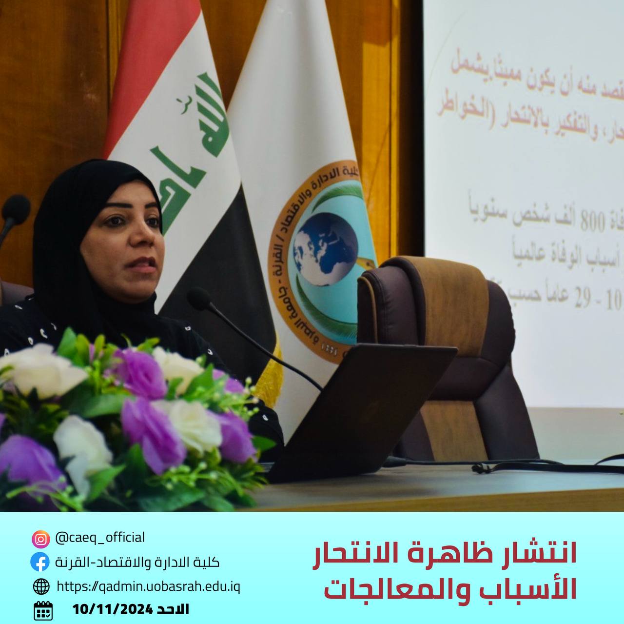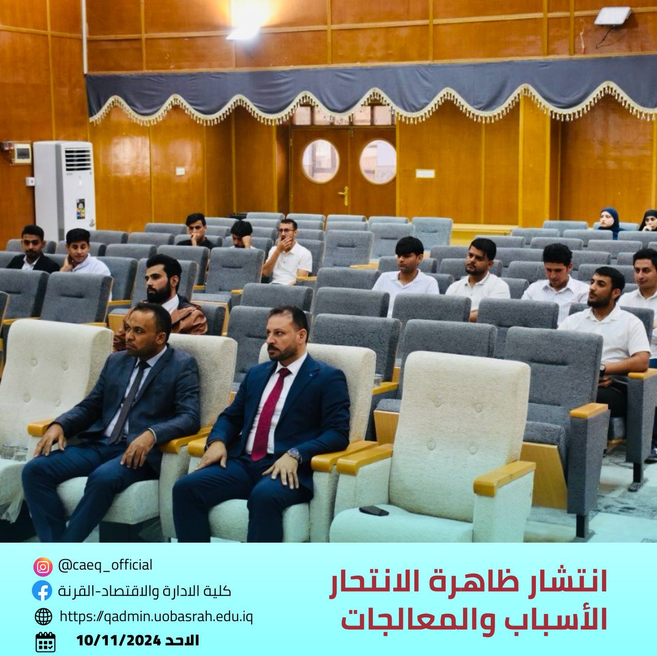 The College of Administration and Economics – Al-Qurna at the University of Basra organized a scientific symposium titled “The Spread of Suicide Phenomenon: Causes and Solutions” on Sunday, November 10, 2024, presented by Assistant Professor Dr. Arafat Nasser Jassim.