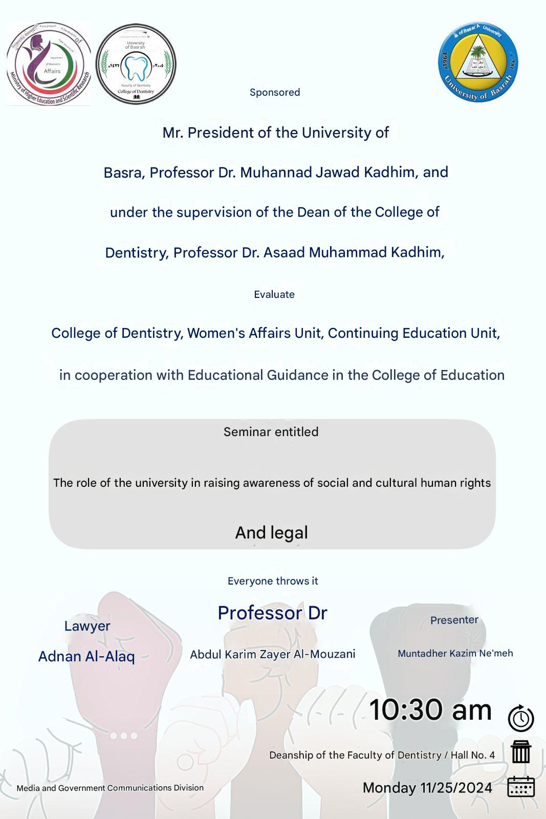 The College of Dentistry, in cooperation with the Women’s Affairs Unit and the Continuing Education Unit, will hold a symposium entitled “The Role of the University in Raising Awareness of Social, Cultural and Legal Human Rights.”
