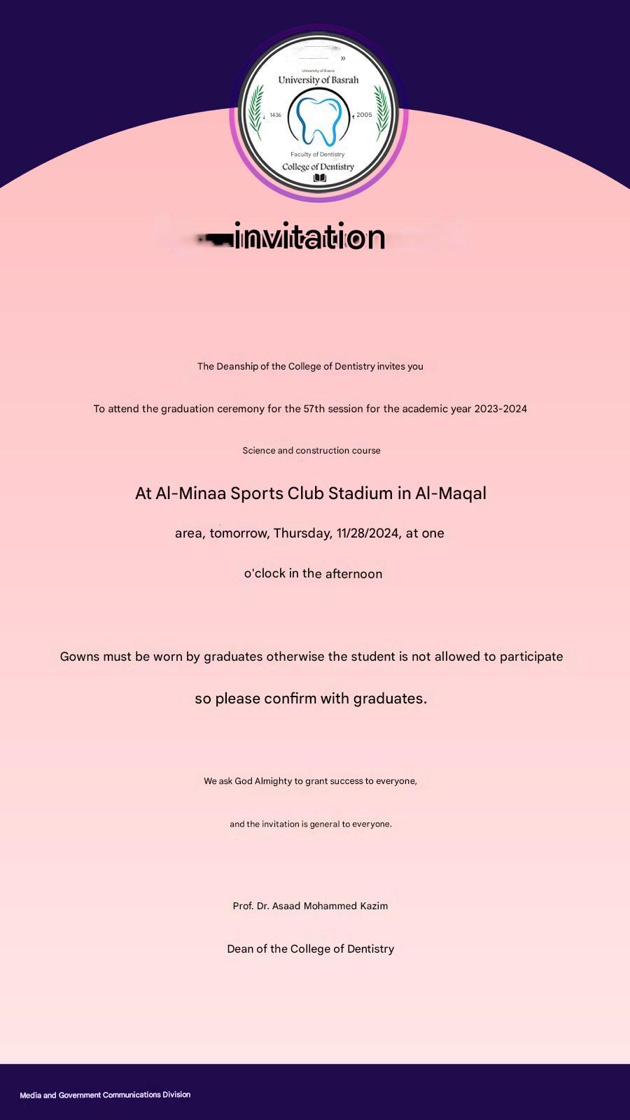 Invitation from the Deanship of the College of Dentistry to attend the graduation ceremony for the 57th session of the academic year 2023-2024