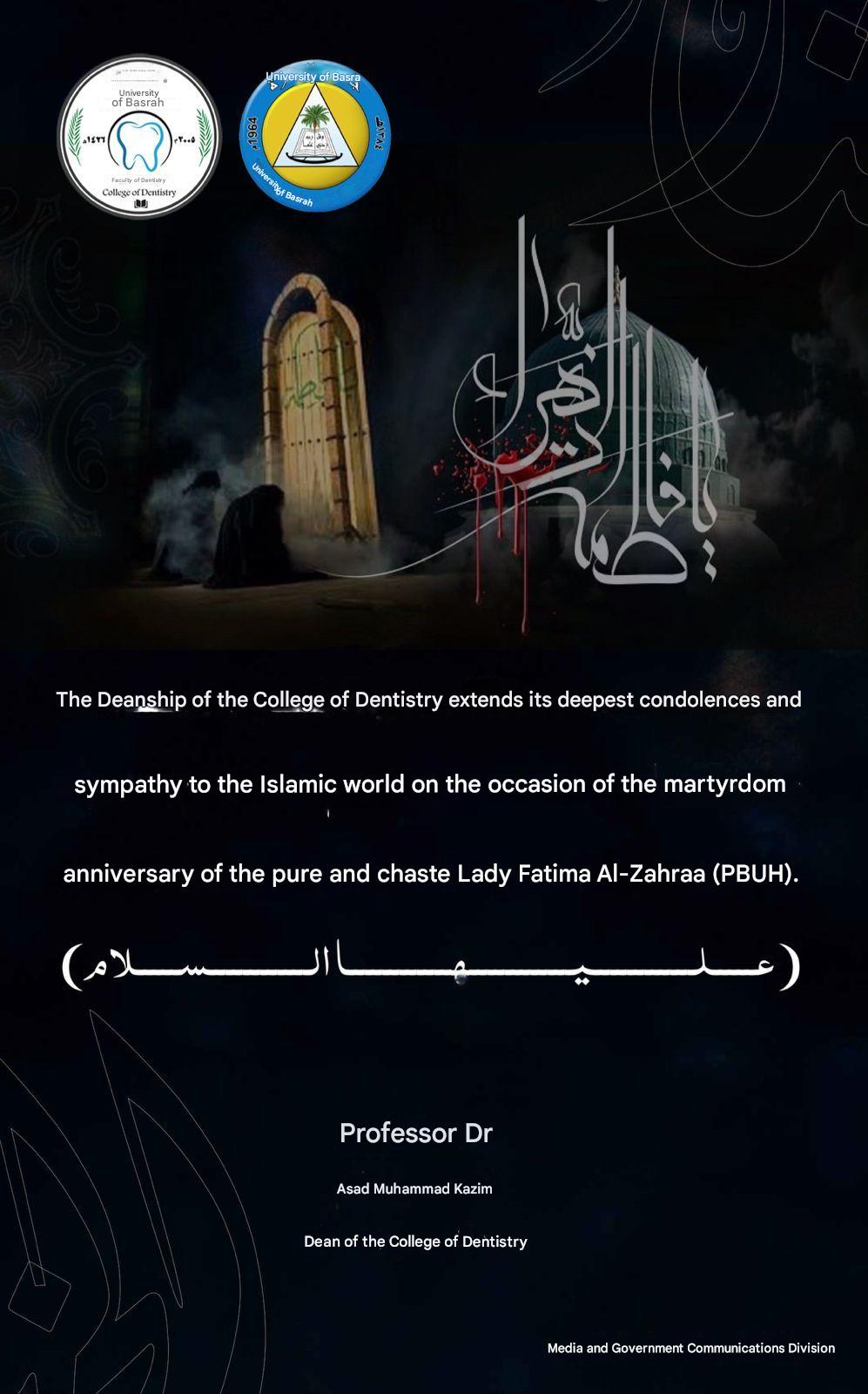 Condolences of the Deanship of the College of Dentistry on the anniversary of the martyrdom of the pure and chaste friend (Fatima Al-Zahra), peace be upon her