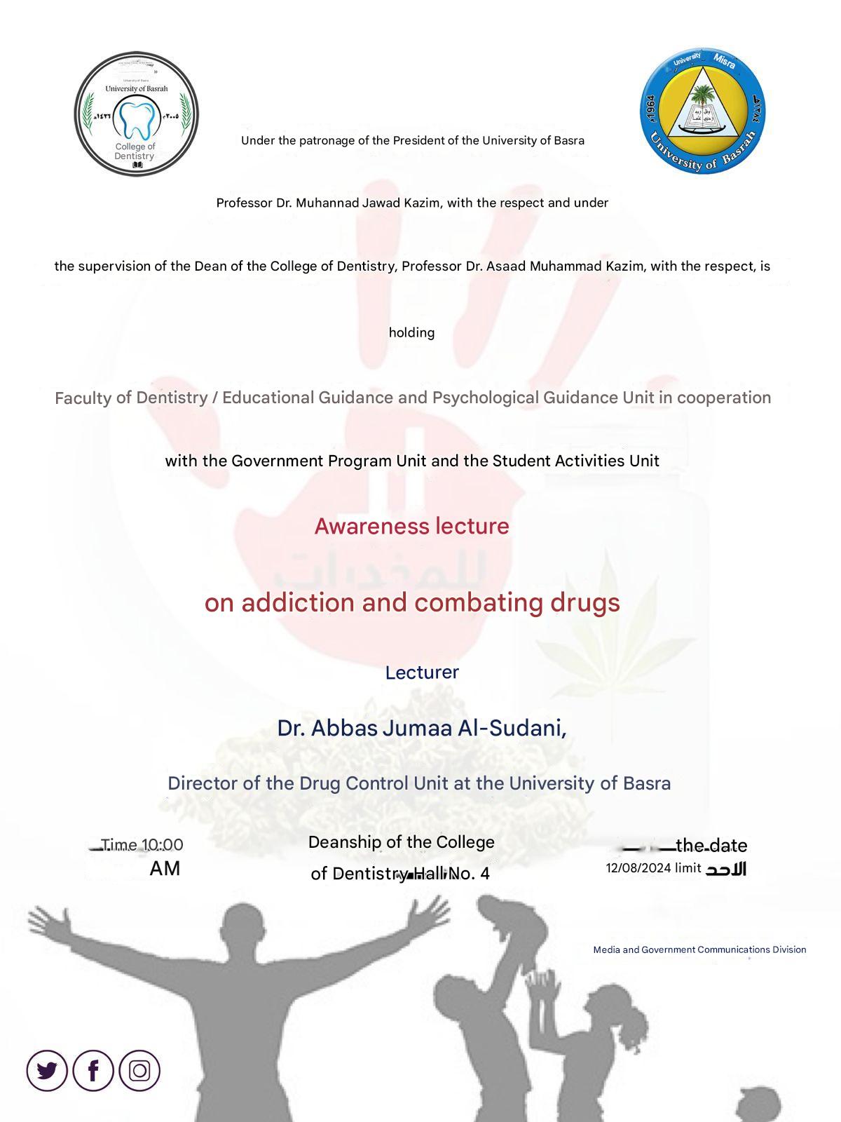 The College of Dentistry, in cooperation with the Educational Guidance and Psychological Counseling Unit, will hold an awareness lecture entitled (On Addiction and Combating Drugs).