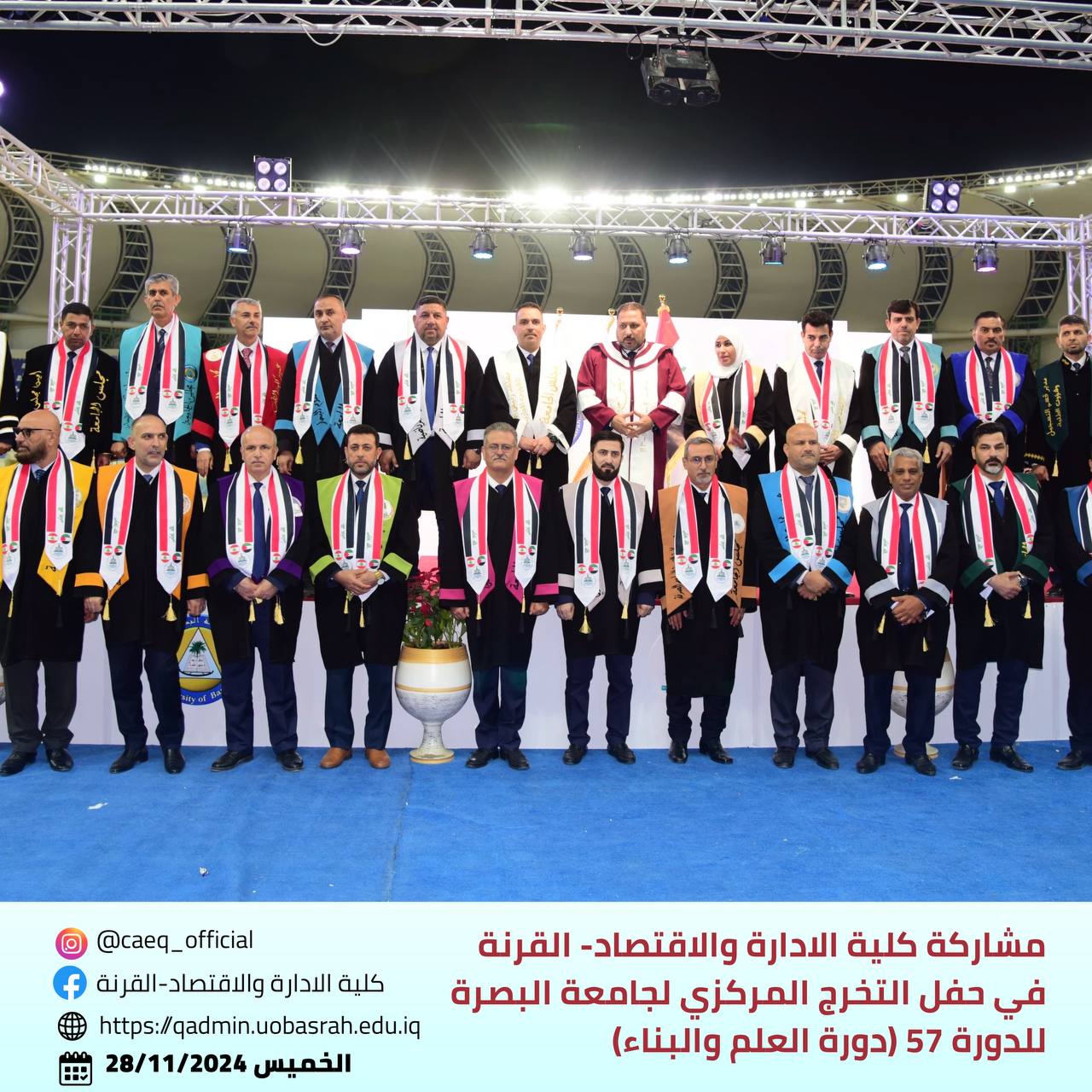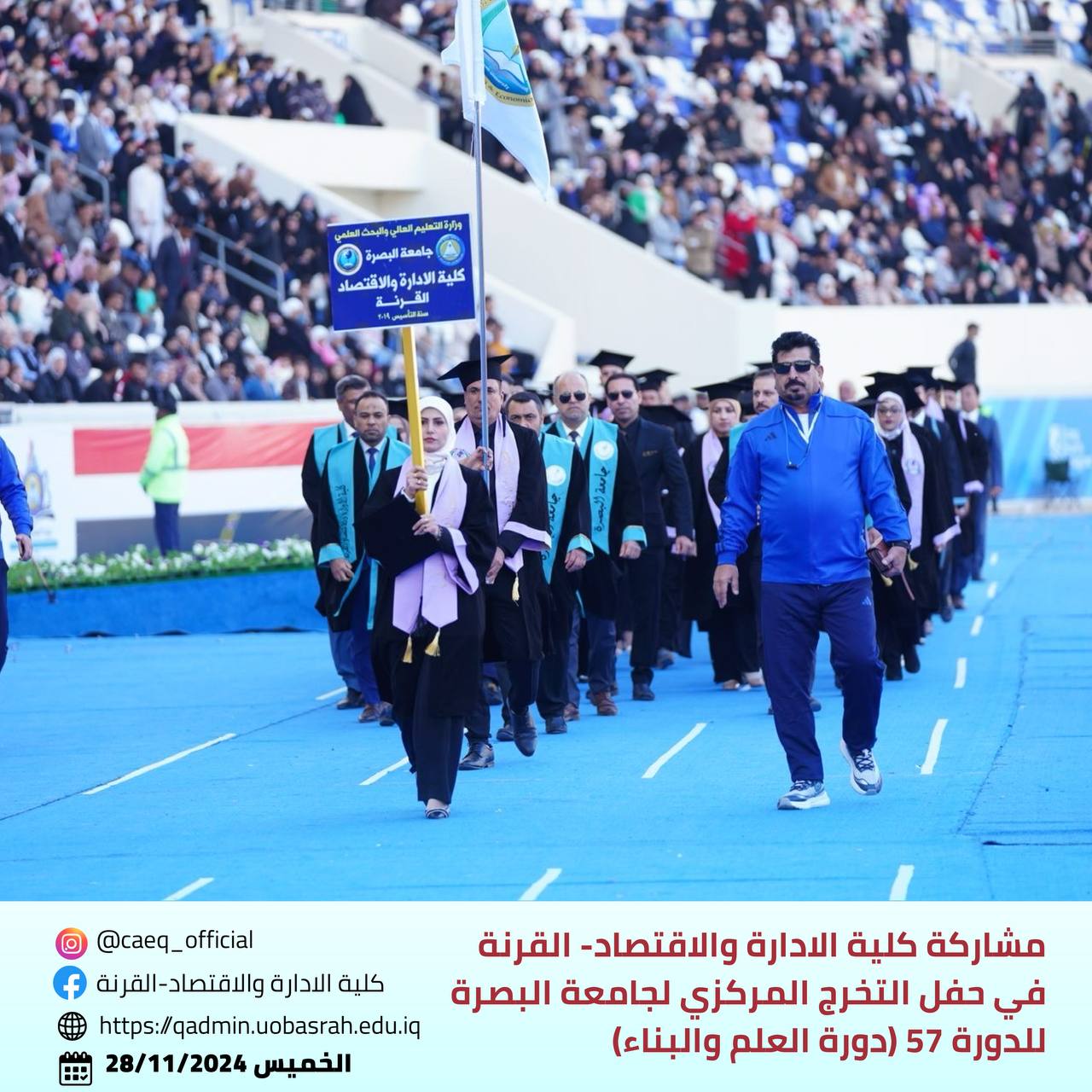 The College of Administration and Economics - Qurna actively participated in the central graduation celebration of the 57th batch (Batch of Science and Construction) of the University of Basra, held on November 28, 2024, at the Al-Mina Sports Stadium.