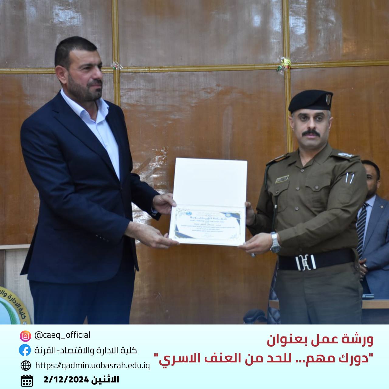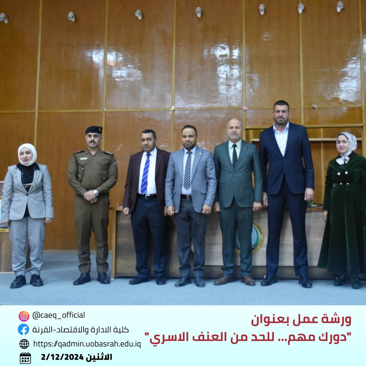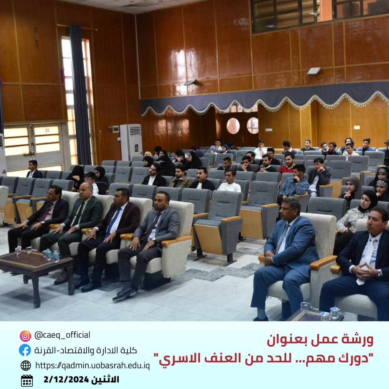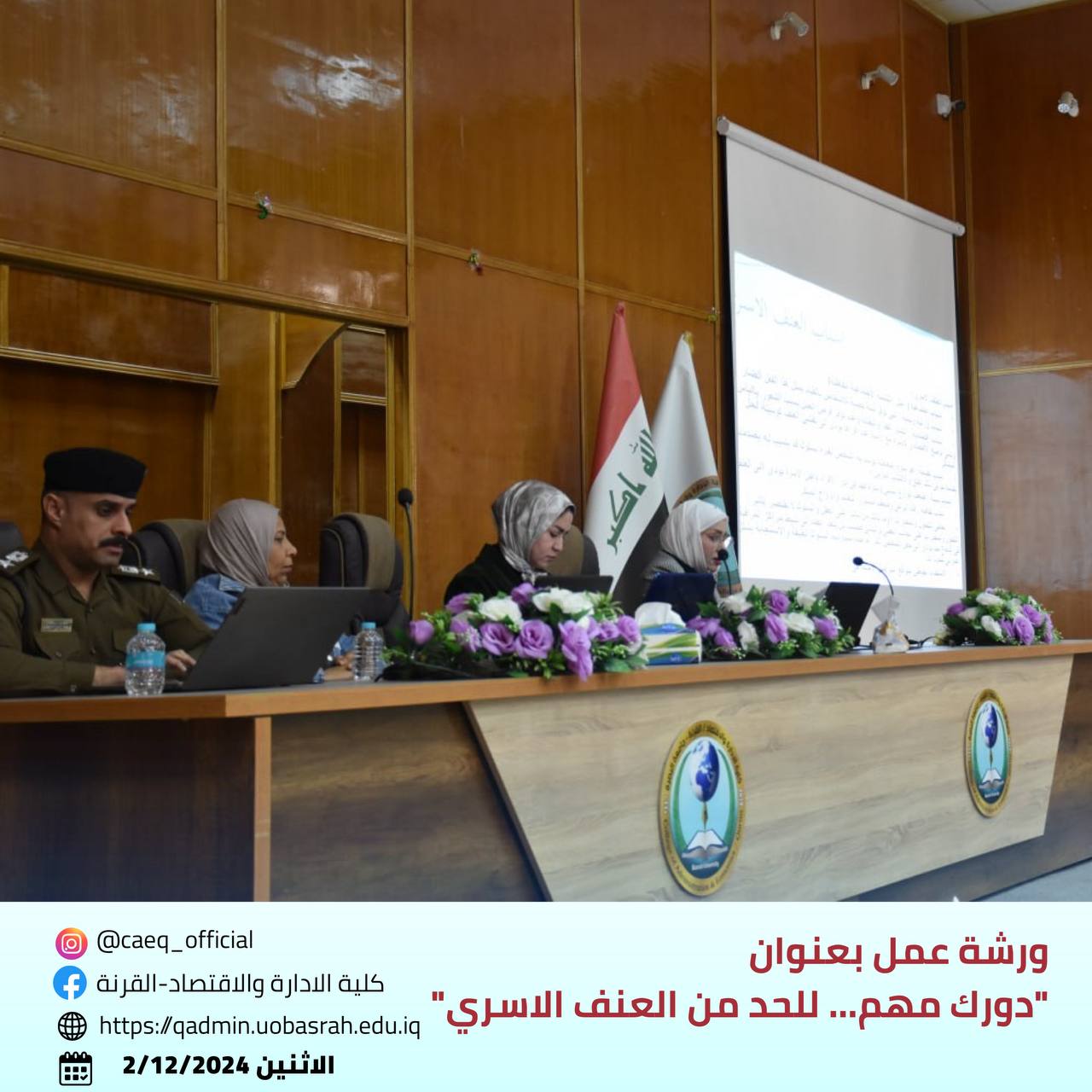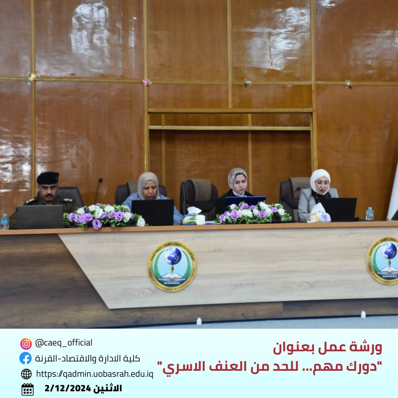 The College of Administration and Economics - Qurna/ Women’s Affairs Unit at the University of Basra, in cooperation with the Continuing Education Unit and the Educational Guidance and Psychological Counseling Unit, organized a workshop titled "Your Role Matters... To Reduce Domestic Violence" on Monday, December 2, 2024.
