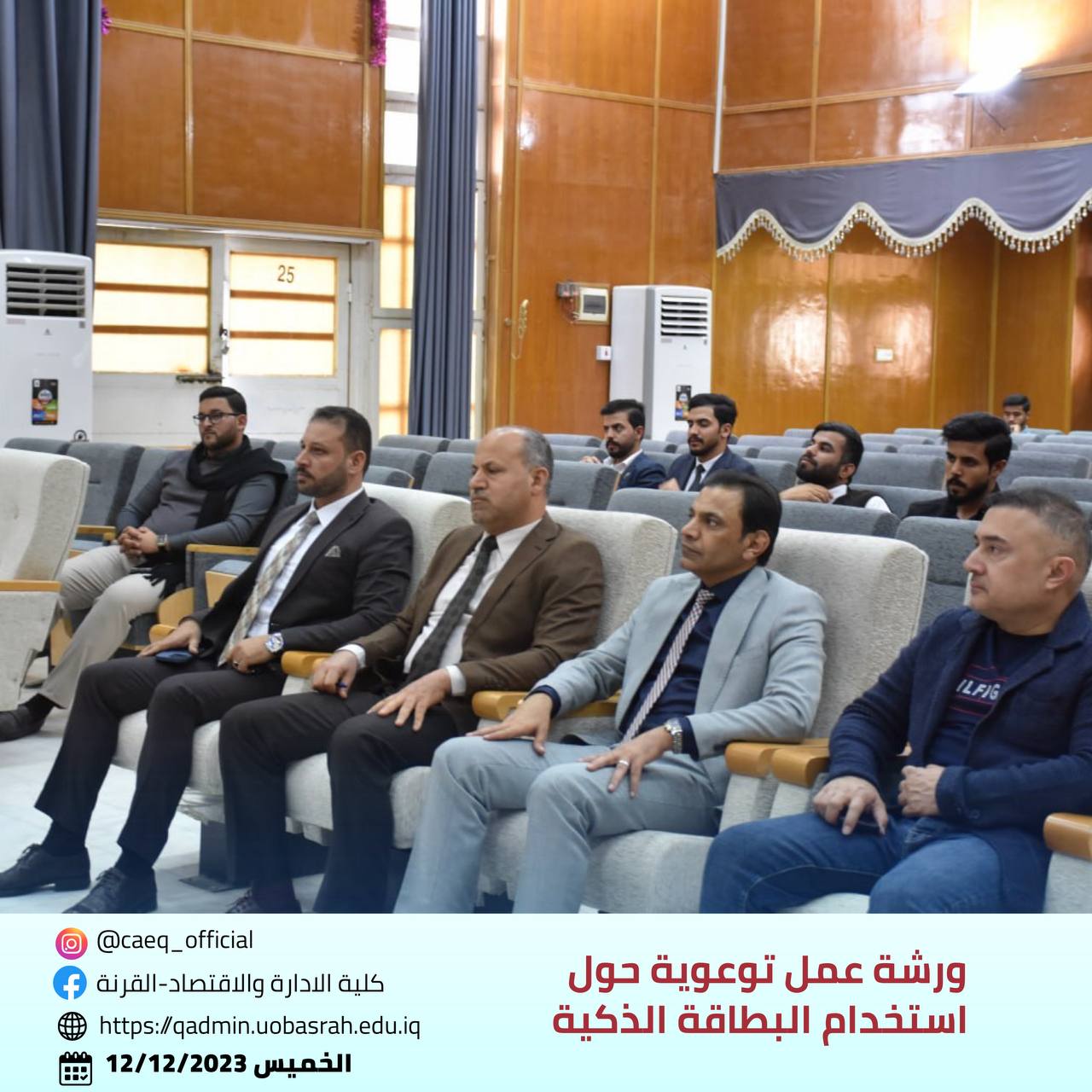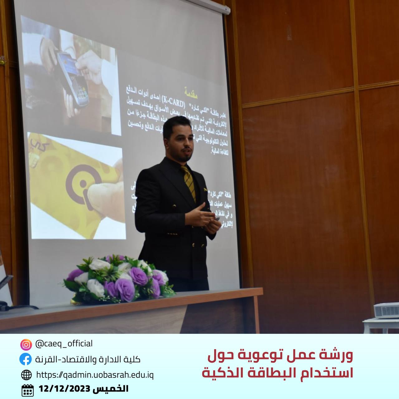 The College of Administration and Economics - Qurna, University of Basra, organized an awareness workshop on the use of the smart card on Sunday, December 8, 2024. The workshop was presented by Dr. Arfat Nasser Jasem, along with students Hassan Lebanon Khairallah, Naba Nawfal Faisal, and Manar Mousa Hatem from the Department of Finance and Investment / Fourth Year.